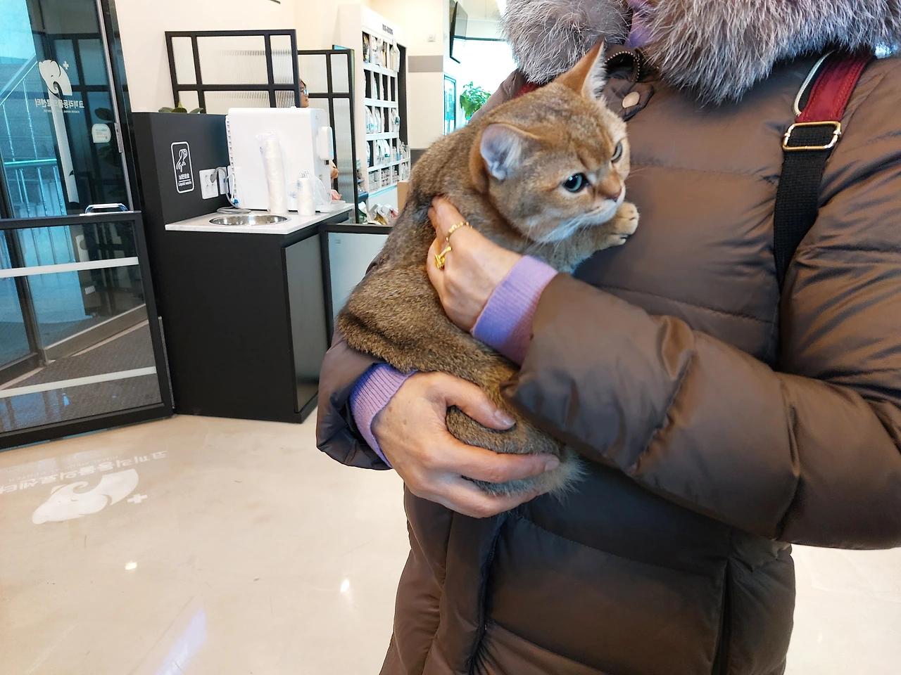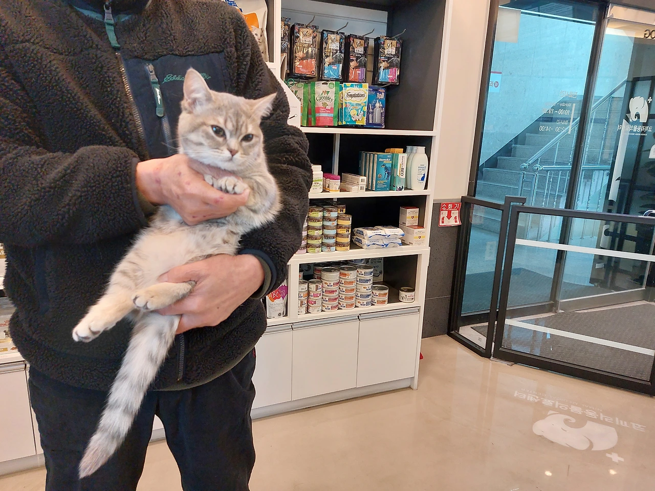 병원 가기 전날,아무리 냐옹거려도 밥을 주지 않았어. 금식하라고 했나 봐. 두 집사가 나를 껴안으면서