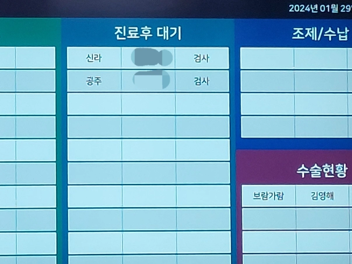 "신라 보호자님, 2번 진료실로 들어오세요."