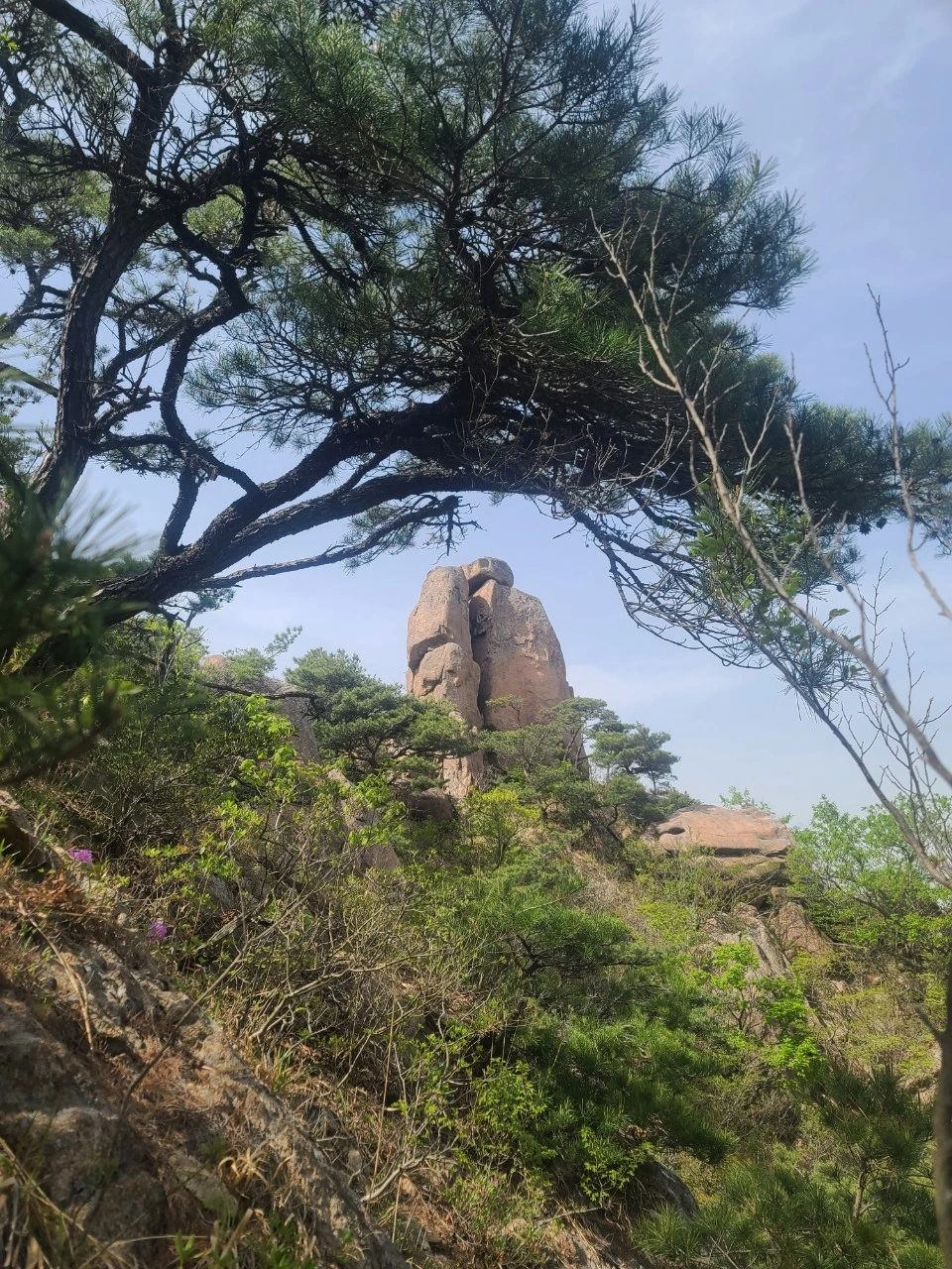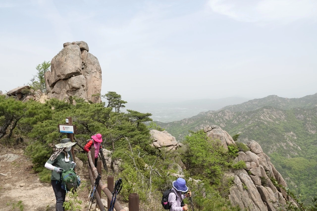 그때부터 다들 하얗게 질렸다. 현재 우리 위치와 오전에 출발했던 도림사 장군당 지점까지 얼마나 남았는지 도무지 알 길이 없었다. 4월의 햇살은 점점 기울어 가는데 벼랑 끝에서 핸드폰은 무용지물이 되었다. 범위를 벗어났다는 말만 되풀이할 뿐이었다. 막 닿은 천리 벼랑길에서 갈팡질팡 하고 있을 때, 휴전선 지역에서 군복무했던 도반님이 이리저리 둘러보더니 4~5미터 바위 아래를 내려가면 될 것 같다고 했다. 먼저 본인이 나뭇가지와 돌틈을 비집고 내려가는 데 성공했다. 평균 연령이 60대인 우리로서는 무리이지만 그나마 이 길이 아니면 내려갈 수 없는 상태라서 결정할 수밖에 없었다.
