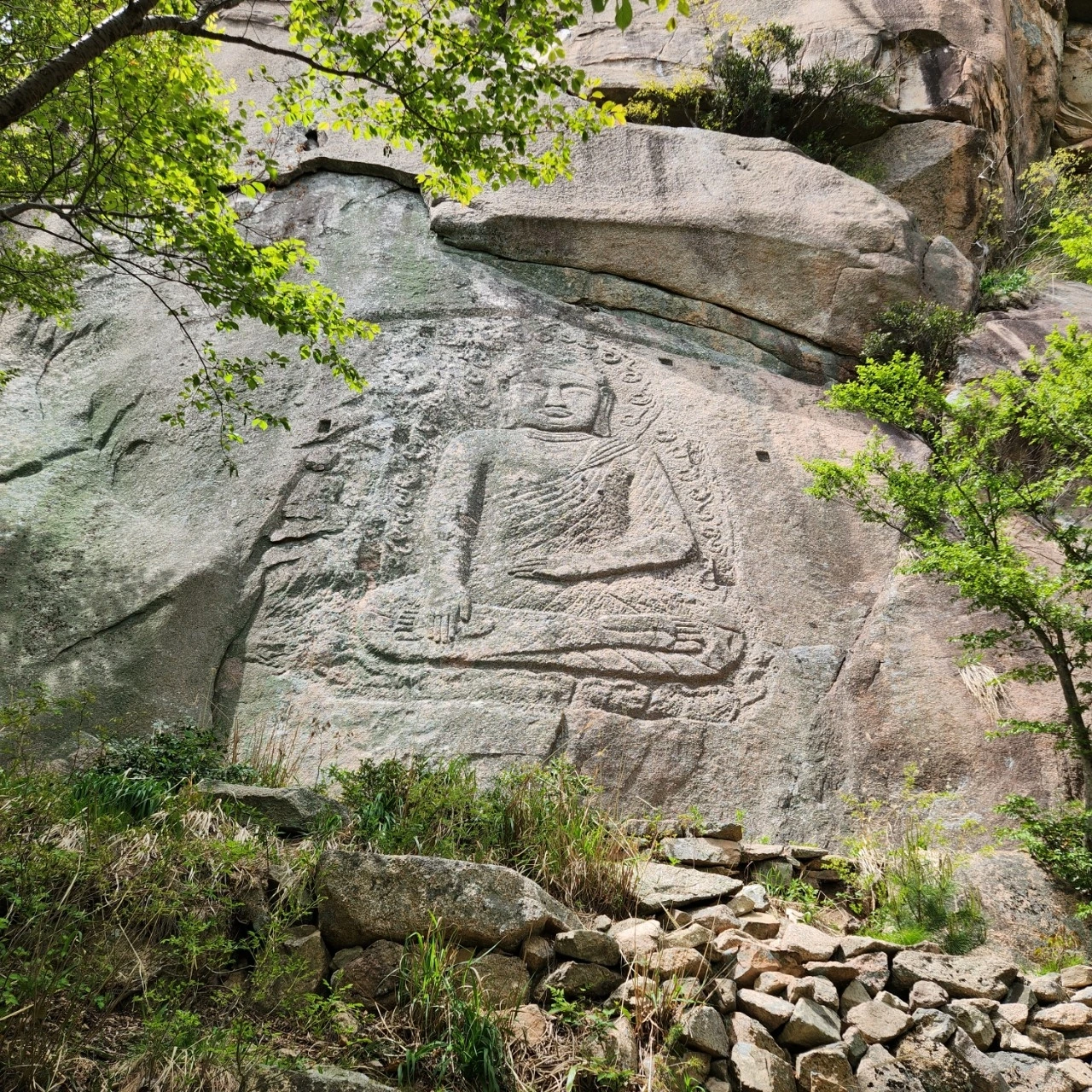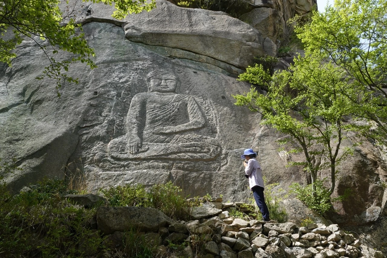 구정봉 마애불과는 부조의 조각과 웅장함은 비교할 수 없을 정도로 열악했다. 신체에 비해 두 배는 크게 보이는 여래의 얼굴과 불균형적인 비례는 그리다가 실패한 모습 같았다. 그러다 보니 일 년에 몇 사람이나이곳의 마애불을 참배했을까 하는 생각에 연민의 마음들이 일어나 금강경 독송과 예불을 경건하게 모셨다.