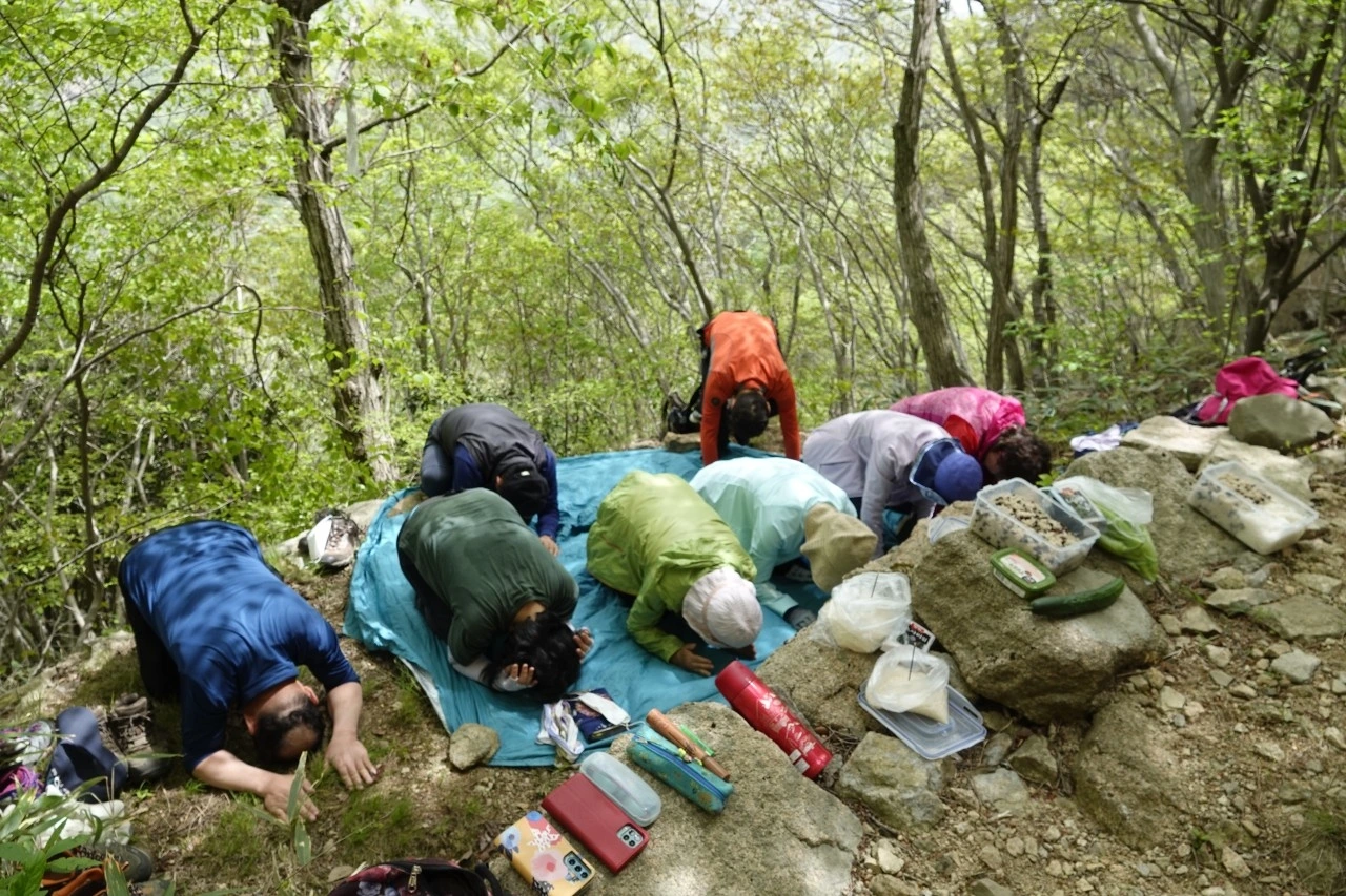 잡목이 빽빽하게 심어져있어서 도저히 길을 낼수 없었고, 사방이 꽉꽉 막힌 데다 9명이 함께 모여 있으니 호흡 곤란과 어지러움이 동반되었다. 손 한 뼘 들어갈 수 없을 정도로 잡목과 가시나무가 뒤엉켜 있고, 위로는 무성한 잎들이 자라고 있어서 서 있기조차 힘들었다. 우리는 엉거주춤 자세로 산악 대장만을 바라보았다.