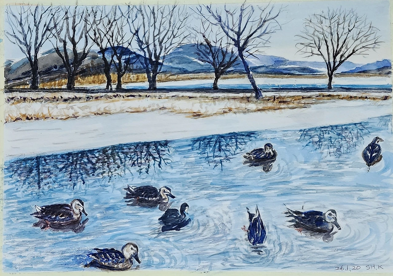 거거서 본 겨울을 나는 오리와 물닭 모습이 나처럼 춥다.