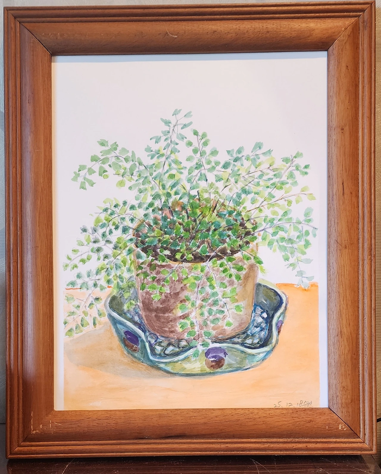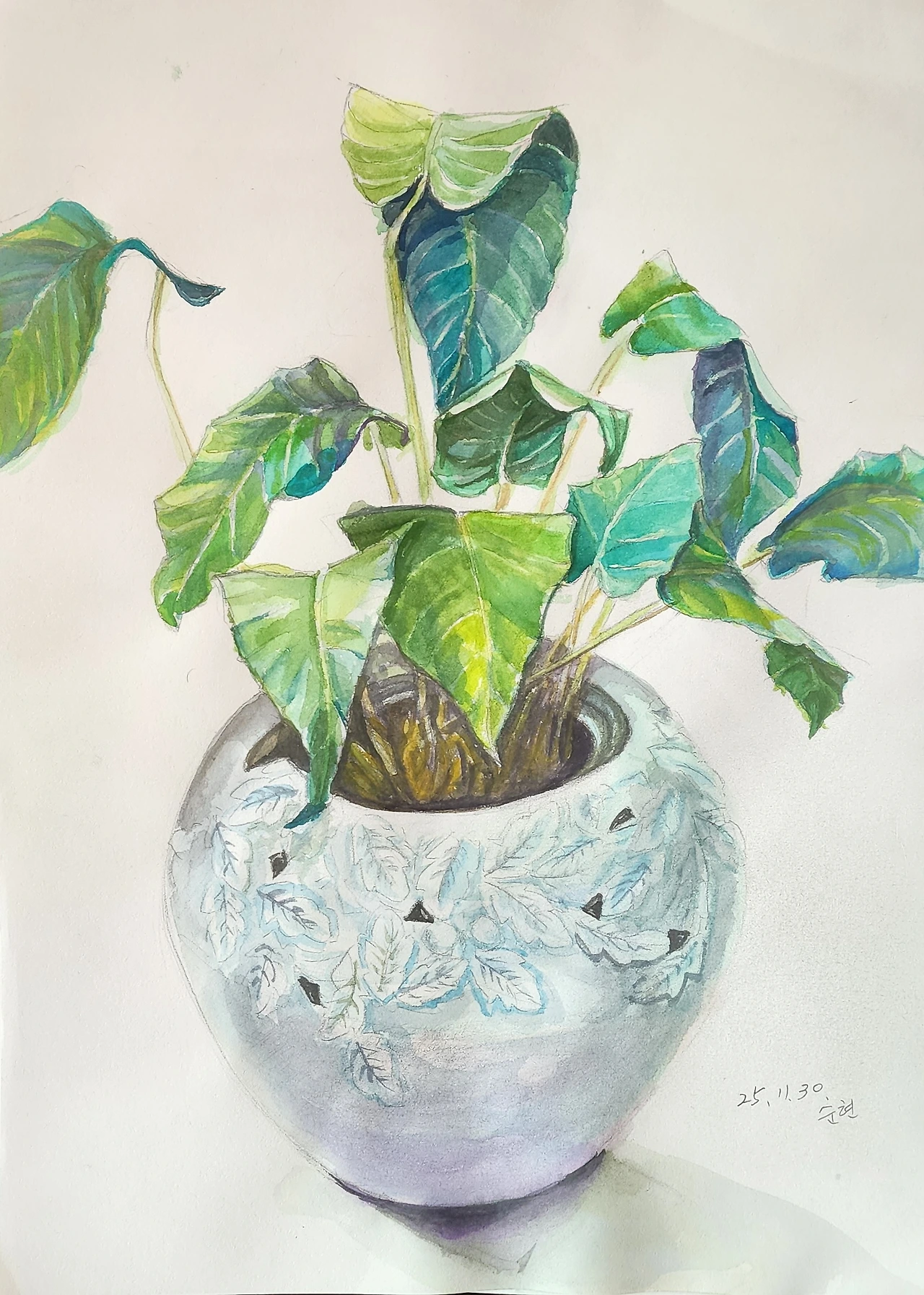 칼라데아 무사이카를 밤에 스케치하고 아침에 채색을 하려는데 달라졌다. 분명 어제는 잎들이 축 늘어졌었는데, 아침에 보니 그 가는 줄기에 의지해 큰 이파리를 똑바로 힘차게 들고 있다. 그래서 내 마음대로 채색했다.