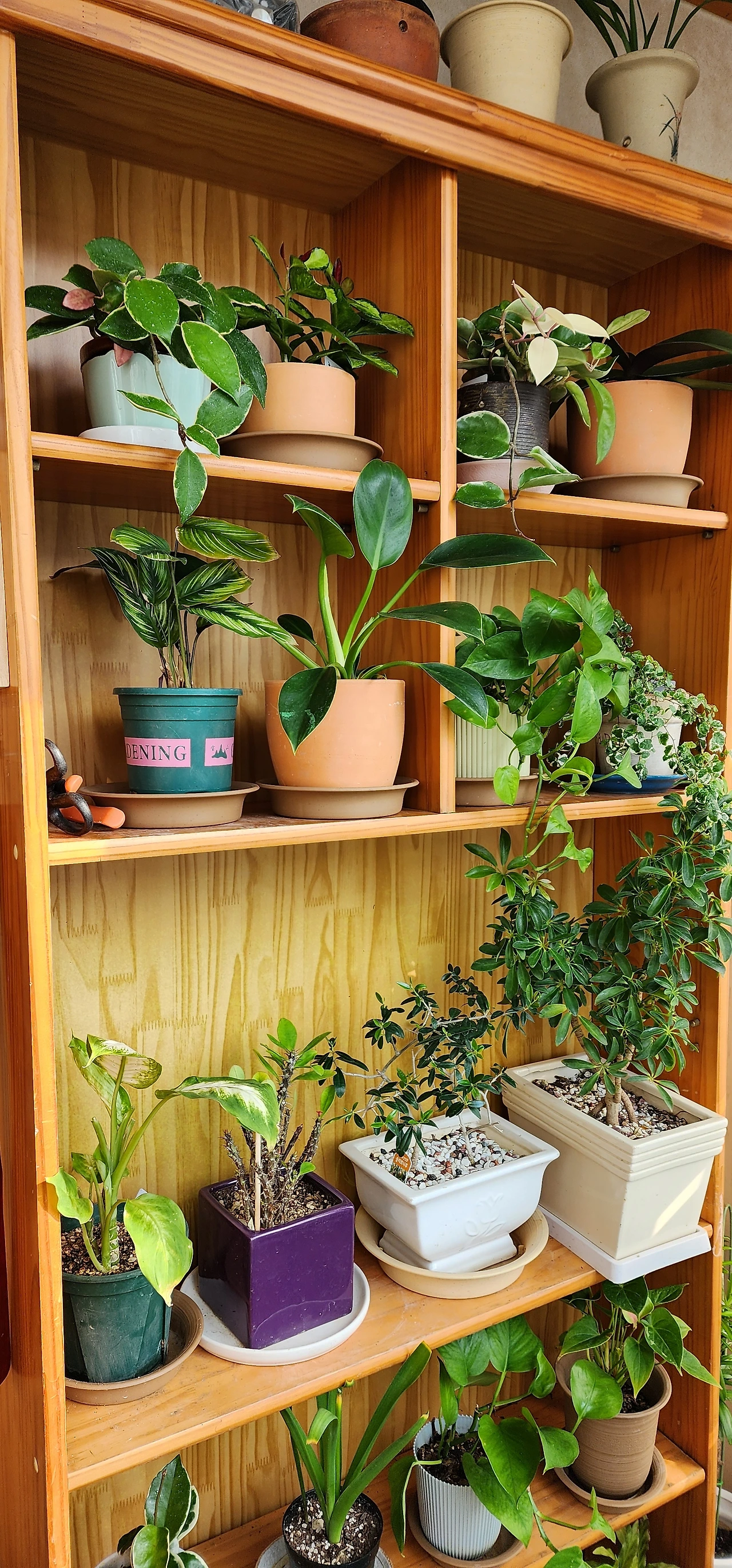 은퇴한 남편은 50여 년간 모은 책을 반이상 버렸다. 책장도 분리수거되었는데 그중 차마 버리지 못한 책장, 아들에게 사준 것들 2개는 베란다로 가서 책 대신 식물을 키우는 집이 되었다. 그래도 책장은 6개가 남아있고 책은 빼곡하다.