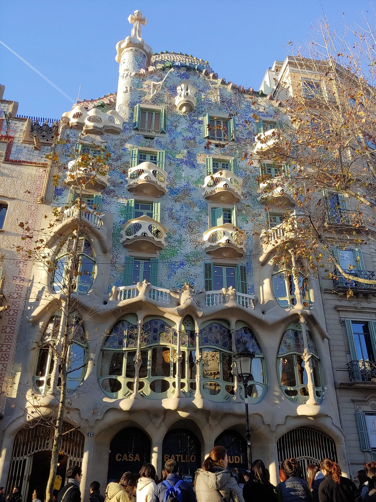 숙소를 나와 카사 밀라 반대편 방향으로 걷다 보니, 유독 인파가 몰린 건물이 있었다. 가우디의 걸작, 까사 바트요였다. 첫눈에 압도되는 독특한 외관은 과연 '뼈의 집'이나 '용의 등뼈 집'이라 불릴만했다. 해골 모양의 발코니와 용의 비늘처럼 꿈틀대는 모자이크 지붕은, 건축이라기보다 하나의 거대한 조각 작품 같았다. 가우디의 상상력이 빚어낸 이 경이로운 건축물은, 1900년대 초반에 지어졌다는 사실이 믿기지 않을 만큼 시대를 앞서 있었다.