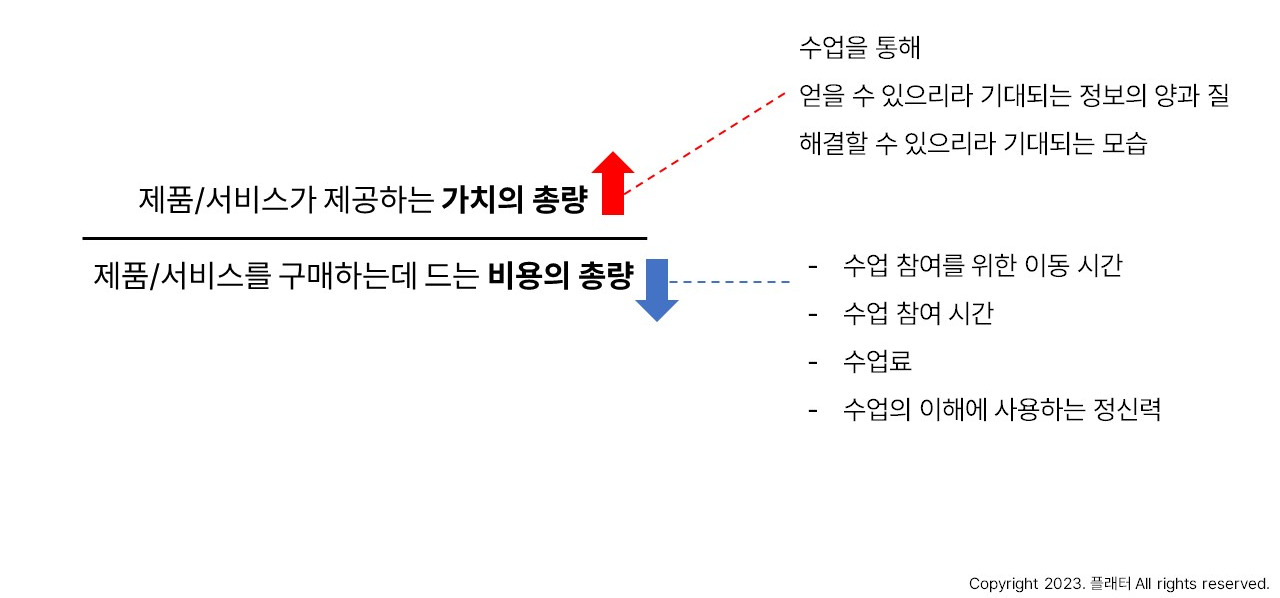 모든 제품과 서비스는 이를 구매하거나 사용하는데 드는 비용 대비 더 많은 가치를 제공하는 게 기본이다. 그런데 이때의 비용은 단순히 '돈'만을 의미하지는 않는다. 고객의 시간, 노력과 정신력 역시 비용에 포함된다. 교육에 참여하기까지 걸린 시간, 교육에서 사용하는 시간, 교육의 내용을 이해하기 위해 들이는 정신적인 노동력 역시 고객의 입장에선 비용이다.