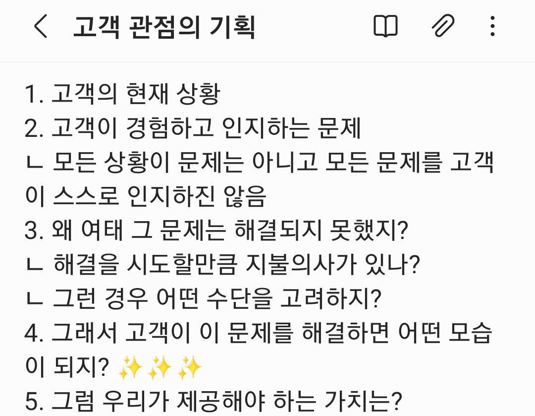 이런 글을 적다 보니 드는 당돌한 생각 하나. 기획 관련 미팅에서 회의가 길어지고 의견 수렴이 안되면 그건 어느새 고객의 성공이 아닌 자신의 성공과 자신의 목표에 꽂혀있기 때문은 아닐까. 고객의 성공에 초점이 맞춰진 회의는 길어질 수가 없다. 적어도 절대로 탁상공론일 수가 없다. 고객을 만나 인터뷰해 보고 숫자로 고객의 반응을 확인하기에도 바쁘기 때문이다.