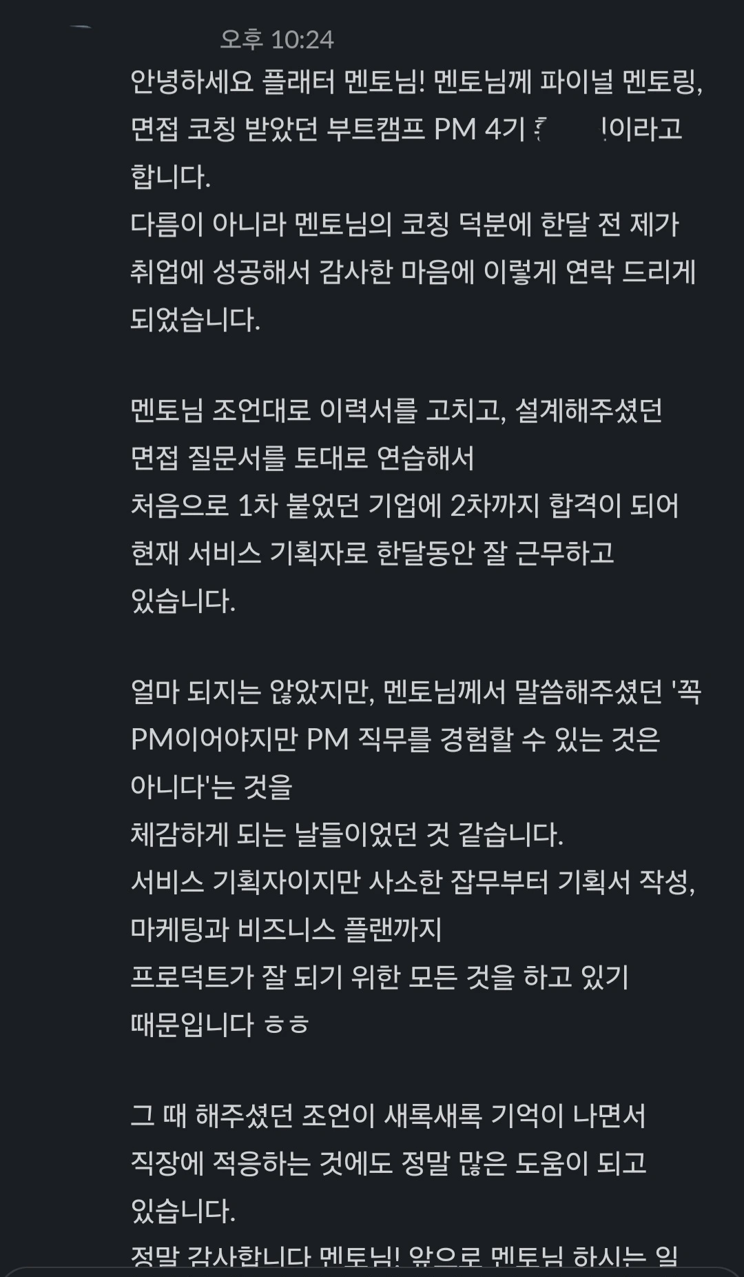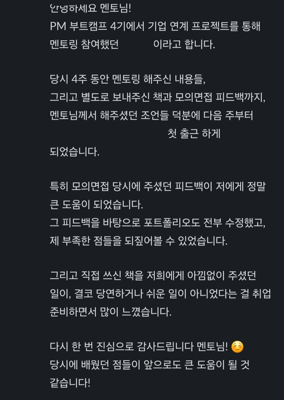 오늘 퇴근길에 즐거운 소식을 접했습니다. 부트캠프에서 멘토와 멘티로 만난 분들이 연달아 취업 소식을 전했는데요, 진심 어린 감사의 인사에 뿌듯하기도 하고 찬 바람도 잊을 만큼 마음이 따스해지기도 했습니다.
