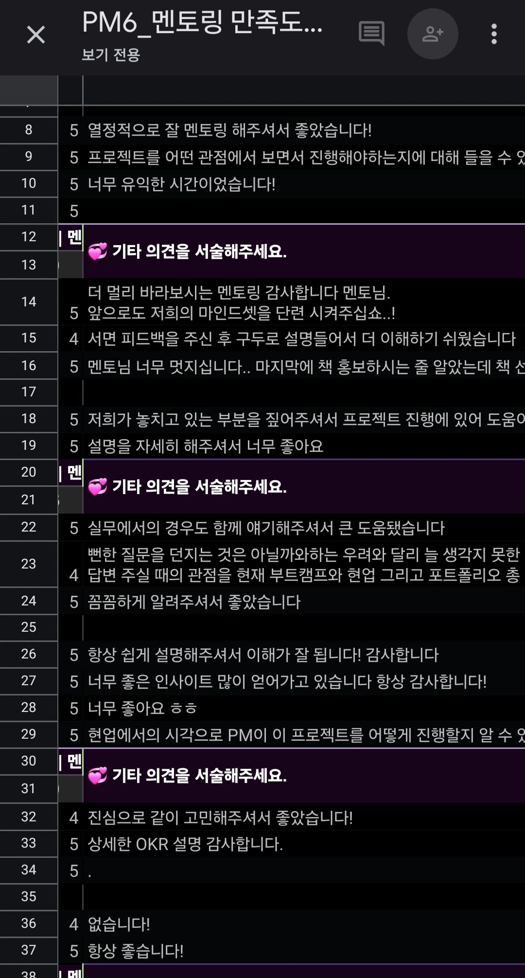 햇수로 3년째 부트캠프를 비롯해 기회가 생긴다면 어디든 마다하지 않고 PM 혹은 분석가로의 취업 또는 직무전환을 희망하는 취준생과 신입을 대상으로 멘토링과 강의 등을 하고 있습니다. 지금도 부족함이 많으니 멘토링을 처음 시작한 즈음엔 오죽 엉성하고 또 어설펐을까요. 성격도 매사 조심스러운데 도대체 무슨 배짱이었는지 모를 일입니다.