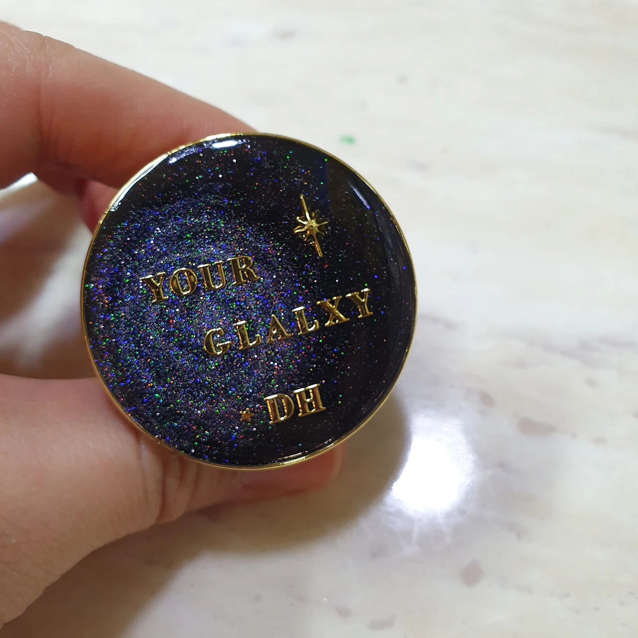 1차 바탕색 작업 후 굳히고, 2차 표현하고 굳히고, 3차 별 파츠나 금속 알파벳 등으로 꾸미고 또 굽고, 4.5차 마무리로 레진용액을 여러 번 통통하게 덧 발라 굳혀줬습니다.