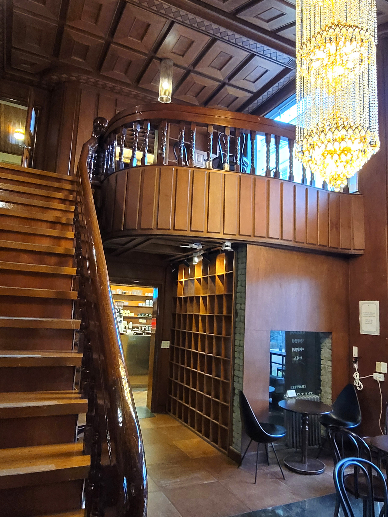 잘 익은 밤색에 기름을 발라 놓은 듯 반질반질한 계단과 좌석들. 80년대 쯤 놀러갔던 친구집이 생각난다. 높은 천정이 아니면 구경할 수 없는 크고 화려한 샹들리에가 보석처럼 빛을 낸다. 어릴때라면 예쁘다고 넋놓고 바라만 봤을텐데, 문득 저기에 먼지가 쌓이면 어떻게 청소를 할지, 나무천정의 한 점에서부터 매달려 있는 무거운 유리장식인데 떨어지지나 않을지 쓸데없는 걱정이 든다. 대로변쪽 차고를 개조한 맨 아래층 공간에 지방의 이름난 특산품과 콘텐츠를 볼 수 있게 이벤트를 열어 전시를 하고 있다. 조그만 장터라도 열릴 모양이다.