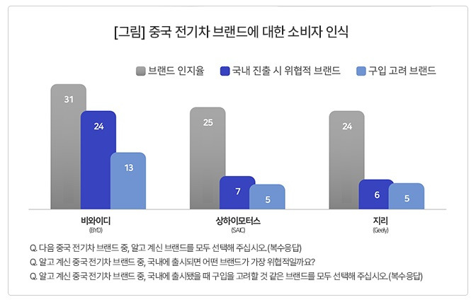 전문 리서치 기관 컨슈머인사이트가 8월 4주차(8월 28~9월 2일)에 10개의 중국차 브랜드 BYD, 상하이모터스, 지리, 니오, 샤오펑, 창안자동차, 지커, 아이안만리장성 모터스, 리오토를 제시한 후 옵니버스서베이 조사를 통해 나온 결과다.