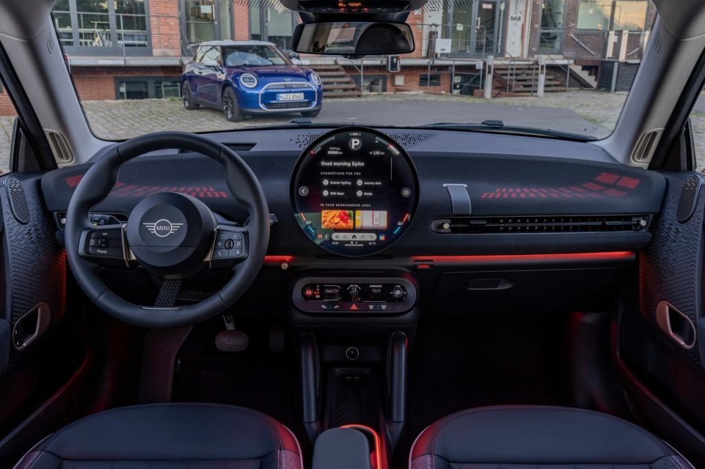 운전석에는 2스포크 스티어링 휠을 장착했다. 특히 대시보드와 도어 트림에는 100% 재활용 폴리에스테르로 만든 친환경 비건 가죽과 직물 소재를 적용했다. 또한 원형 올레드(OLED) 디스플레이가 기본 탑재되고 최신운영체제를 탑재해 티맵 기반의 한국형 미니 내비게이션을 이용할 수 있다.