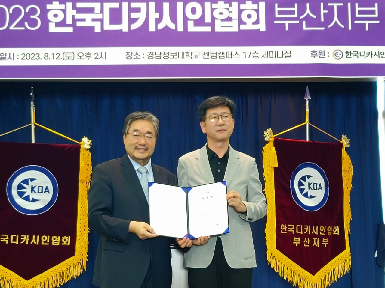 한국디카시인협회 김종회 회장과 지부 고문 위촉장을 받은 경남정보대학교 김태상 부총장이 나란히 포즈를 취하고 있다.
