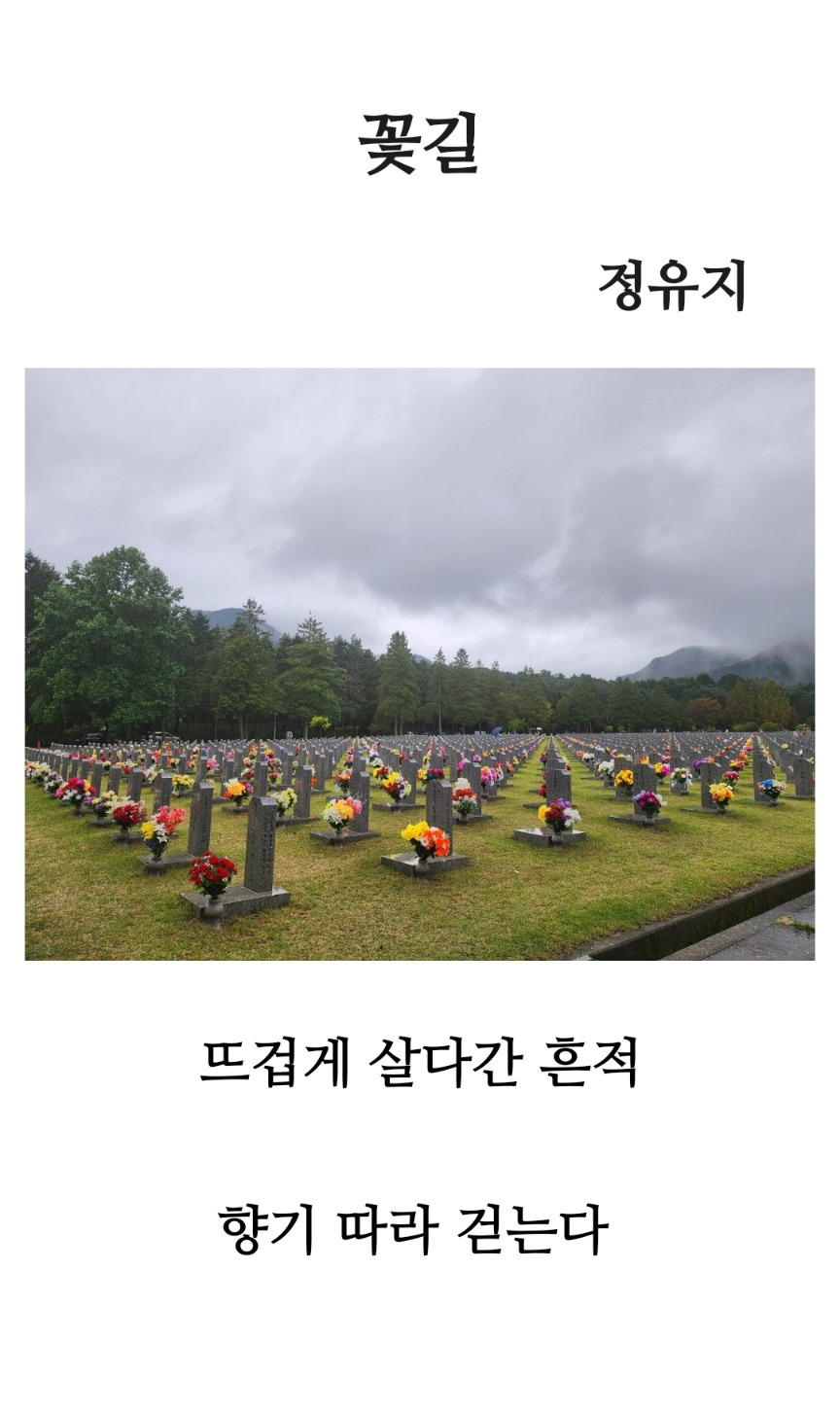 디지털 영상(사진)에는 무덤들이 줄지어 늘어서 있고, 그 앞에 조화나 생화 또는 꽃 장식이 놓여 있습니다. 즉, 산화한 호국영령을 기리는 공간이 됩니다. 여기서 <꽃길>은 단순히 아름다운 길이 아닙니다. 꽃은 눈으로 보고, 향기로 기억되는 대상이지만 동시에 부재와 애도의 흔적이기도 합니다.