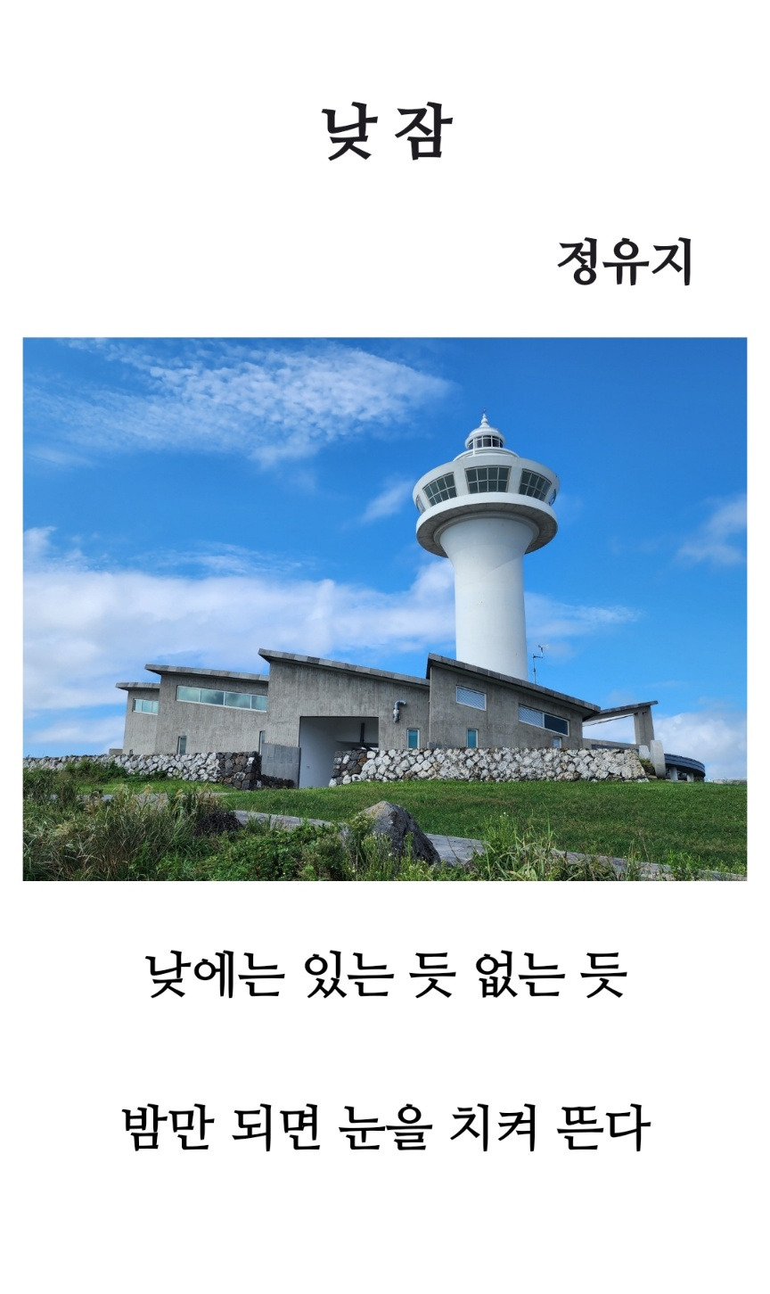 디지털 제목 <낮잠>의 경우, ‘낮의 정적’과 ‘밤의 대비’를 함축한 시간의 은유를 나타냅니다. 디지털 영상(등대)은 빛이 꺼진 현재, 그러나 언제든 깨어날 준비가 된 시각적 장치입니다. 디지털 글쓰기(문자기호)로서 시적 문장은 ‘낮의 무심함’과 ‘밤의 깨어남’을 리듬으로 연결됩니다. 이러한 세 요소는 각각 정지와 작동, 낮과 밤, 휴식과 경계의 개념을 교차시키며 하나의 ‘디지털 생명체(등대)’처럼 살아 움직입니다. 즉, 빛의 알고리즘으로 작동하는 존재의 시학이 완성됩니다.