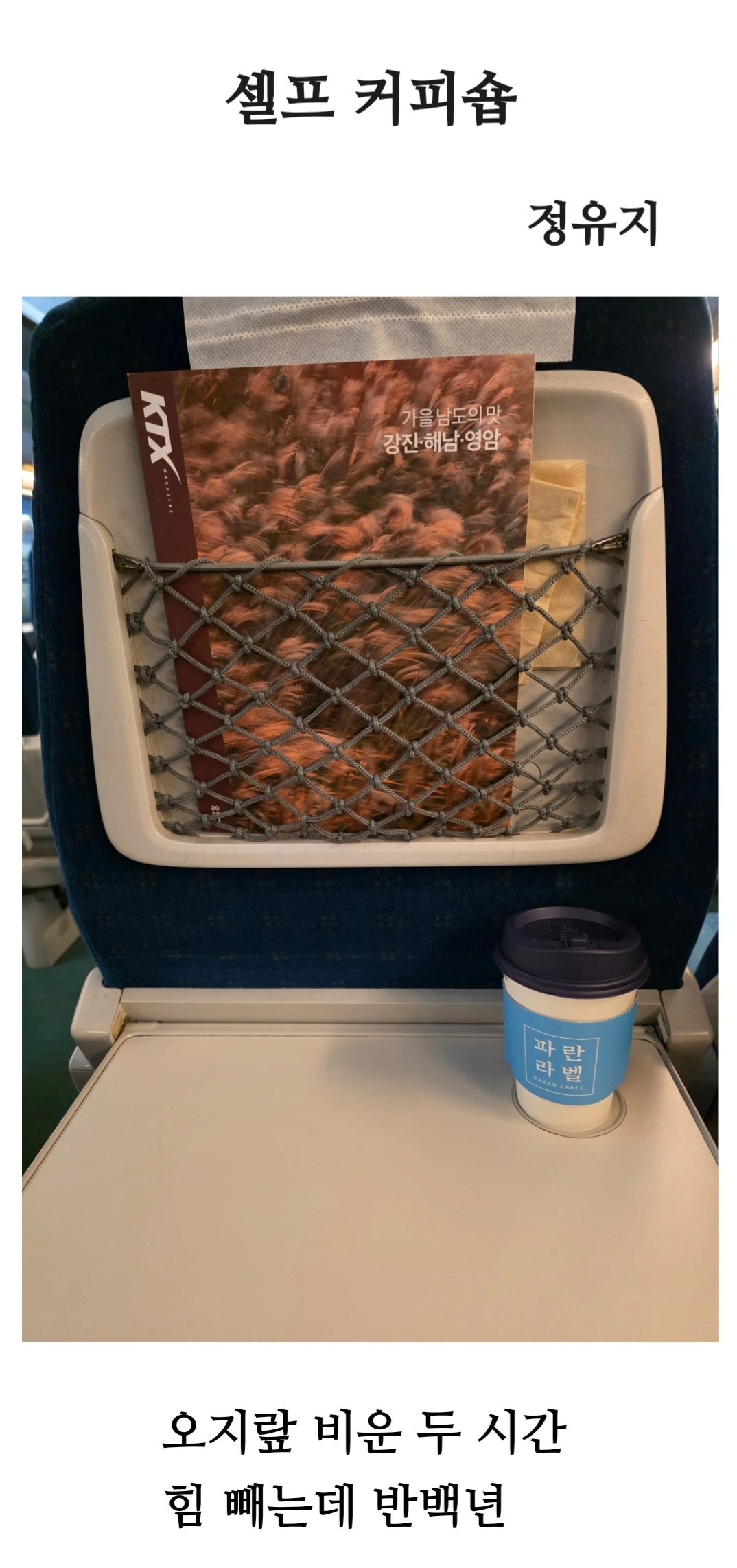 디카시조 ‘셀프 커피숍’은, 인생의 긴 여정 속에서 지친 시간을 견디며 힘을 빼는 모습을 담백하게 풀어놓고 있습니다.