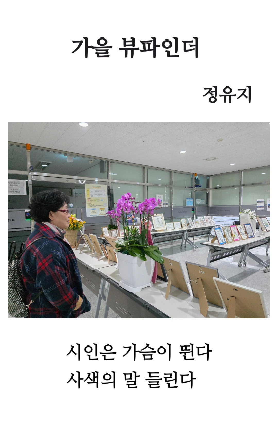 디카시 <가을 뷰파인더>는 경남정보대학교 센텀캠퍼스 4층 어반스케치 전시장 현장을 바라보는 여류시인의 관람 순간을 포착한 작품입니다. 뷰파인더는 카메라로 사진을 찍을 때, 우리가 눈으로 보고 찍을 대상을 확인하는 부분을 말합니다. 쉽게 말하면, 눈으로 보는 화면 같은 역할입니다.