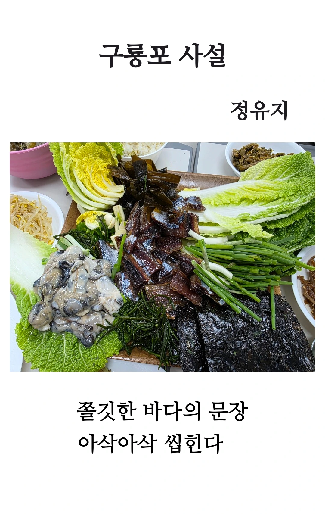 “나는 단지 먹히는 존재가 아니다. 나를 씹을 때마다 바다의 신비와 겨울의 숨결, 그리고 구룡포 사람들의 손길이 살아 숨 쉰다. 나를 통해 자연과 삶이 연결되는 순간, 우리는 진정한 음식의 의미를 체험하게 된다. 쫄깃함과 아삭함 속에 담긴 바다의 문장, 그 속에서 나를 기억해 달라.”