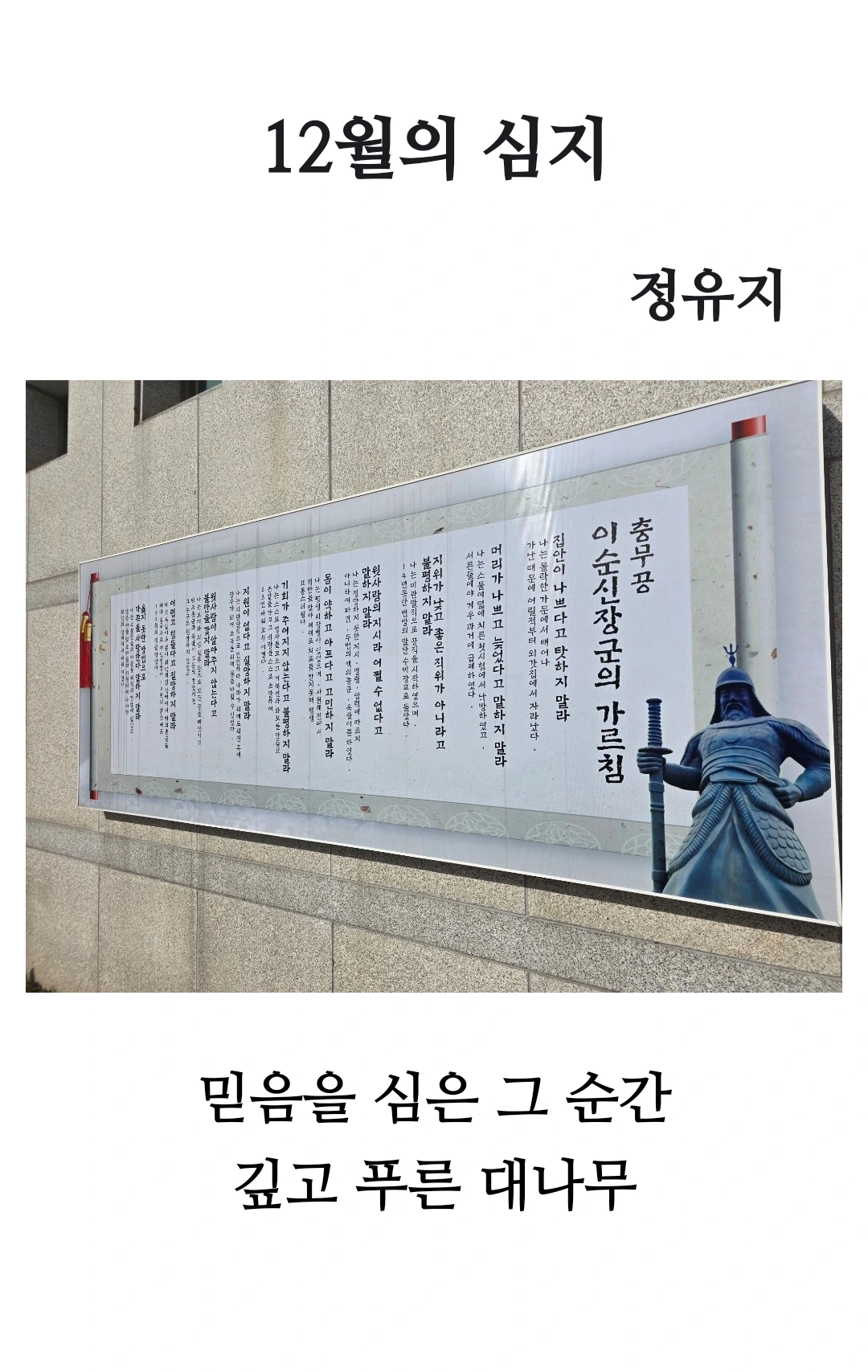 디카시조 <12월의 심지>의 영상 기호(사진) 속 시각적 요소는 단단한 콘크리트 벽면에 부착된 길고 고풍스러운 한 폭의 글귀 패널과 그 옆에 우뚝 선 이순신 장군의 청동상입니다.