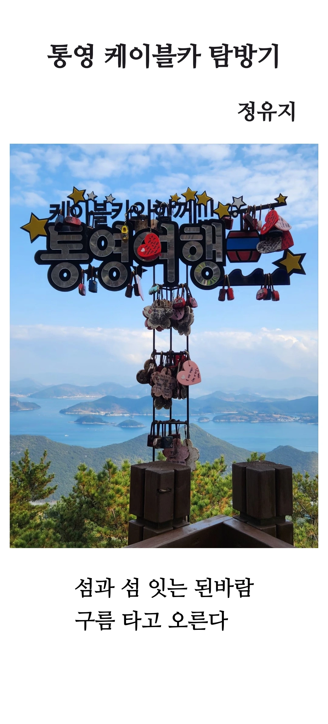 <통영 케이블카 탐방기>는 통영이라는 도시가 가진 감성과 철학, 그리고 여행자가 느낄 수 있는 깊은 감동을 완성합니다. 통영을 찾는 이들은 자연과 바람, 하늘을 타고 자신의 삶을 다시 날게 될 것입니다. 삶의 날개를 달고 만학의 길을 걷는 경남정보대학교 디지털문예창작과 액티브 시니어를 응원합니다.