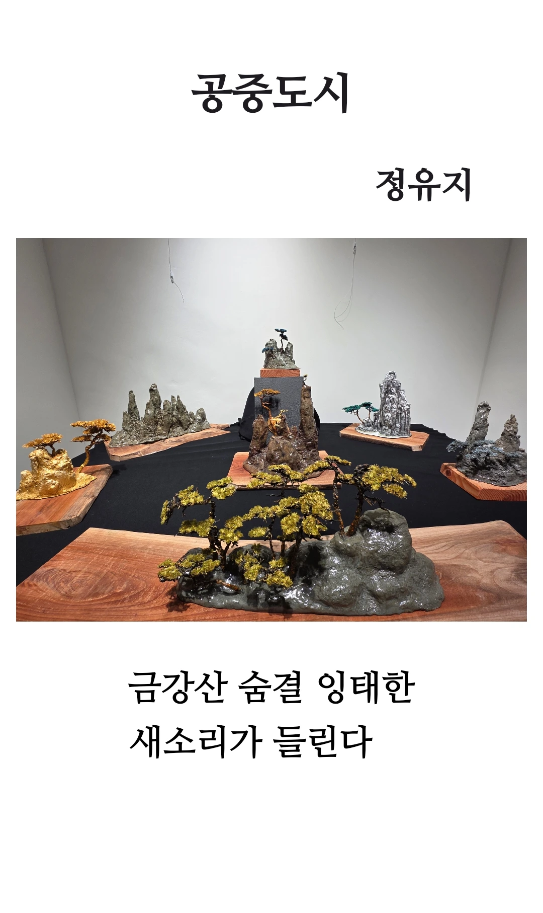 작품 속 미니어처 산과 나무 등이 어우러진 입체적인 조형물을 순간 포착하여 ‘공중도시’라는 개념을 재창조하고 있습니다. 이는 실제 금강산의 웅장하고 숨겨진 자연미를 축소해 보여주며, 현실과 이상(공중도시)의 경계를 넘나드는 상징적 이미지입니다. 검은 바탕 위에 배열된 이 작은 산세들은 고요함 속에서도 강렬한 존재감을 드러냅니다.