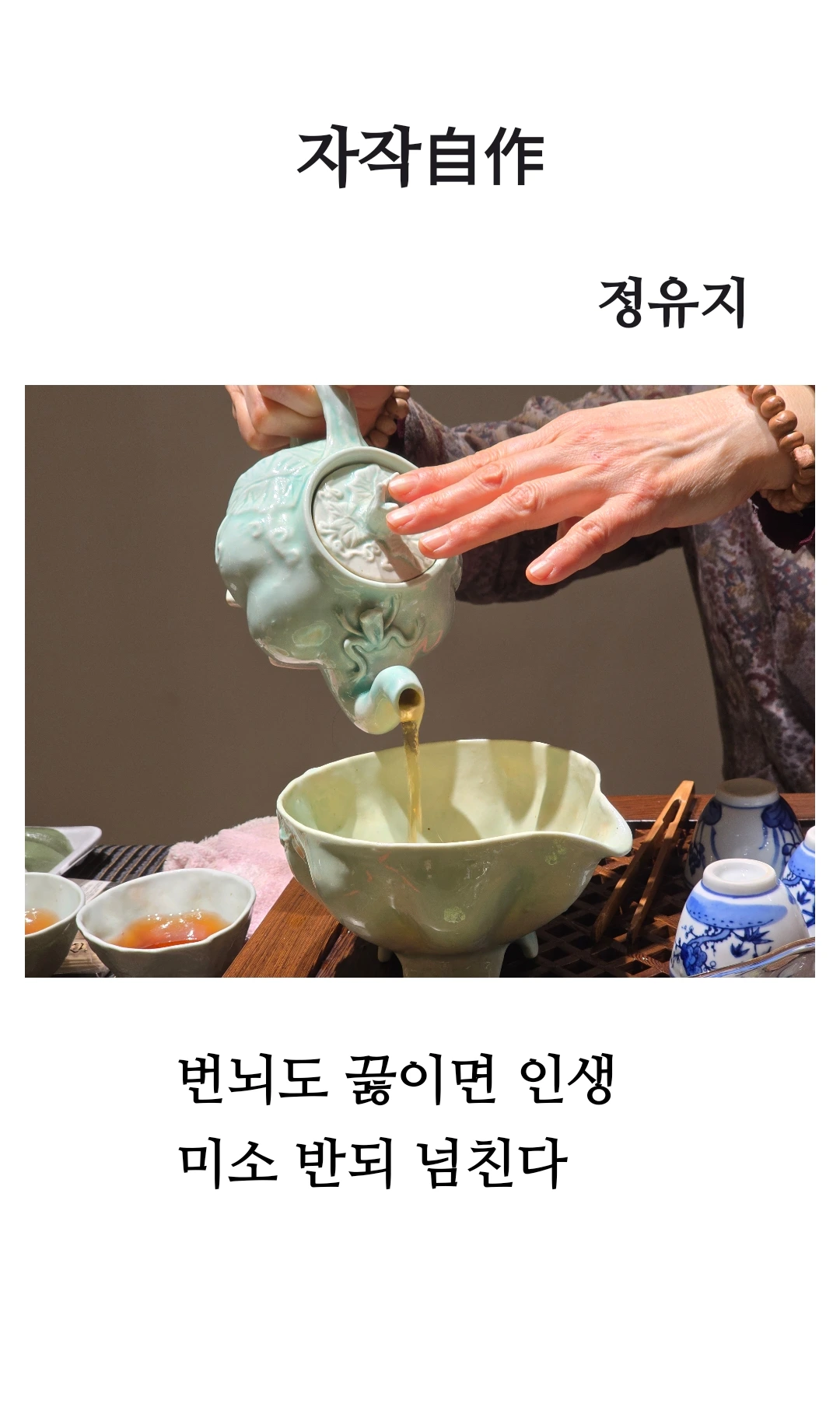 “인생이란 찻잔 속 차처럼 끓고 흐르며, 번뇌 또한 우리 삶의 한 부분입니다. 다도에서 배우듯, 번뇌를 억누르려 하지 말고, 고요히 끓여 그 향과 맛을 음미해야 합니다. 미소를 잃지 않고 순간을 즐길 때, 인생은 비로소 진정한 풍요로움으로 가득합니다. 모든 것은 나 자신이 빚어내는 자작(自作)이기에, 오늘 이 순간 당신의 삶을 정성스러운 다도처럼 소중히 다뤄보시길 권합니다.”