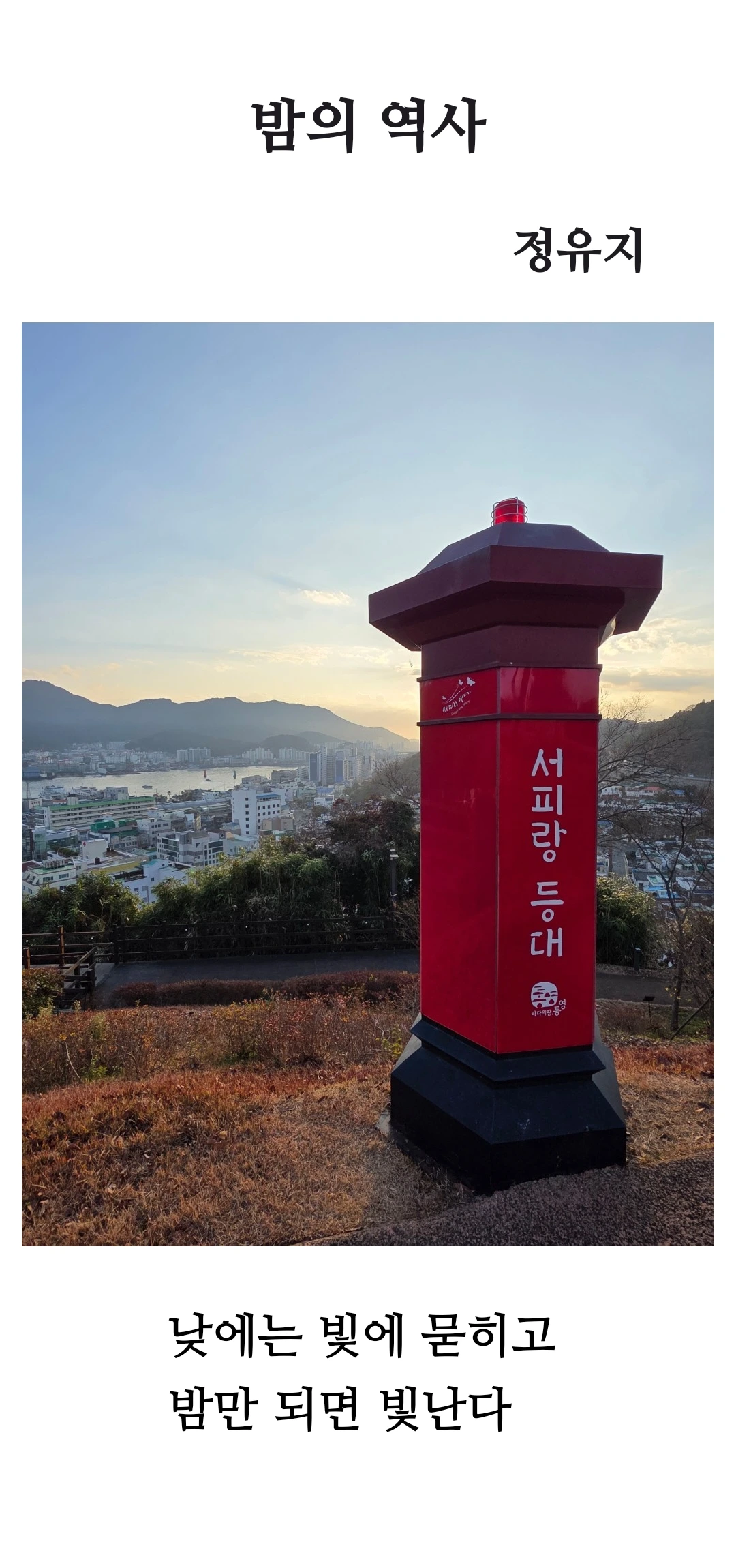 디카시 <밤의 역사>의 영상기호(사진)는 통영의 서피랑 등대가 저무는 해와 함께 담겨 있습니다.