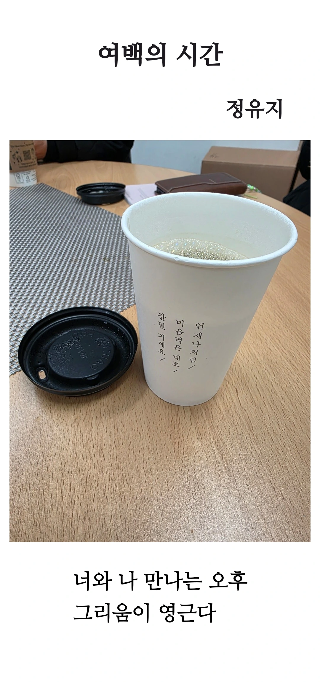 디카시 <여백의 시간>의 영상기호(사진)는 종이컵이 테이블 위에 놓여 있고, 뚜껑이 옆에 열려 있습니다. 종이컵과 음료는 평범한 일상 속 한 순간, 누군가의 작고 소소한 쉼을 상징합니다. 테이블 위의 여백, 주변 공간까지 포함된 조화는 시간 속 ‘빈 곳’을 시각적으로 구현합니다. 컵의 낱낱이 보이는 질감과 음료 위 거품은 정적인 이미지 속에도 미세한 움직임과 생동감을 드러내며, 여백을 채우는 ‘시간의 흐름’을 은유합니다.