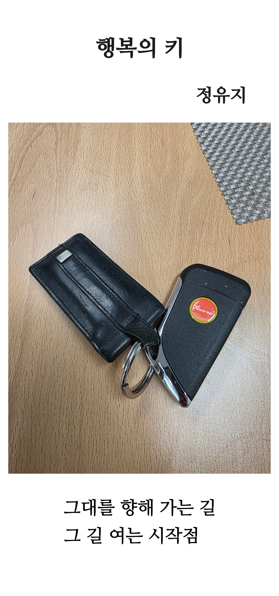 디카시 <행복의 키>의 영상기호는 검은색 가죽 키홀더와 자동차 키가 책상 위에 놓여 있는 순간을 포착했습니다. 키는 일상에서 문이나 차를 여는 도구지만, 여기서는 ‘길’을 여는 상징으로 확장됩니다. 키와 책상 위의 빈 공간(여백)은 ‘새로운 시작’과 ‘도약’을 위한 가능성을 암시합니다.