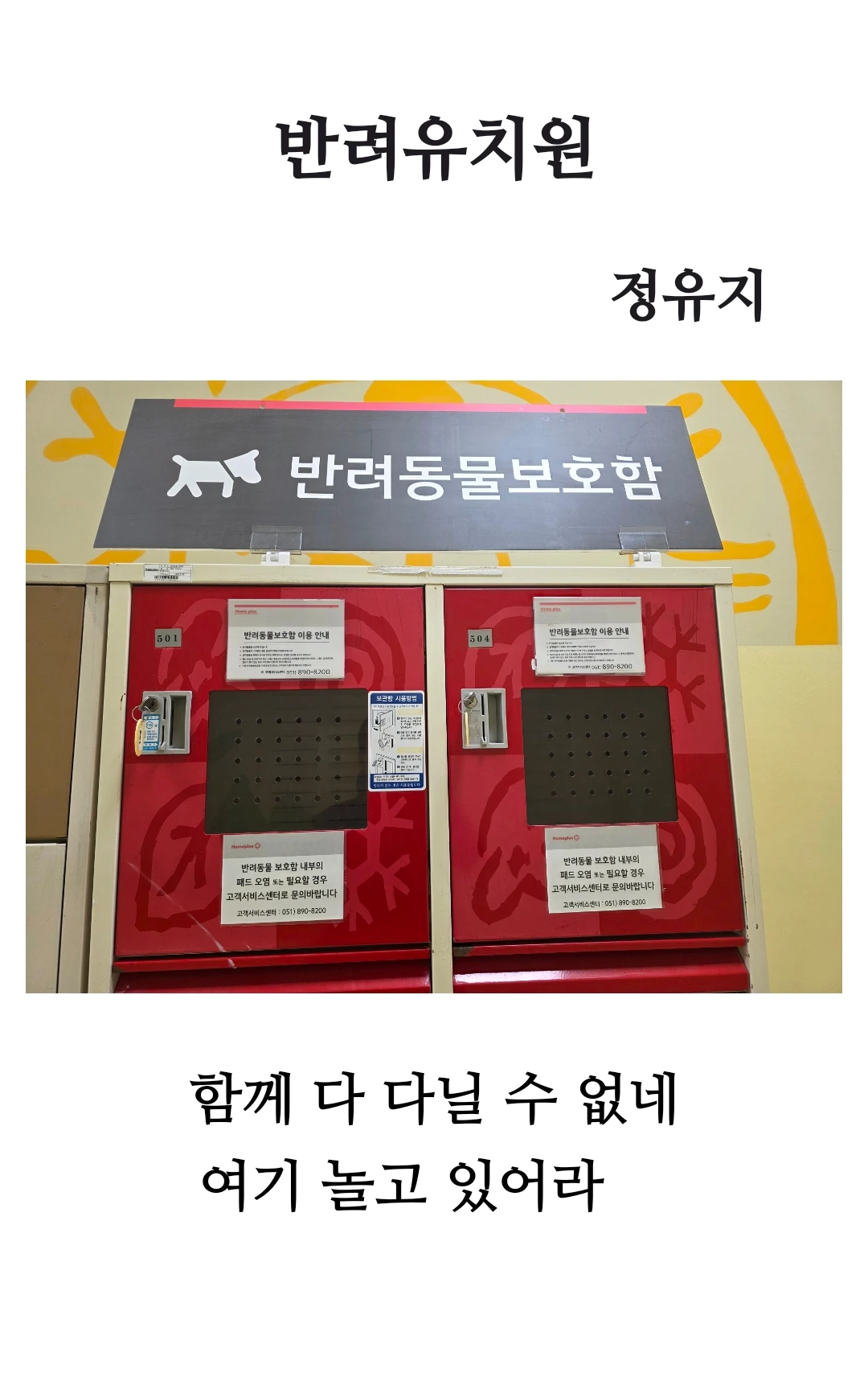 <반려유치원>이라는 제목 아래 짧고 담백한 시적 문장은 반려동물과의 교감이 자연스러운 일상과 배움의 과정임을 암시합니다. ‘반려’와 ‘유치원’의 조화. 즉, ‘반려’는 동행과 위로를 뜻하고, ‘유치원’은 배움과 사회화 공간입니다. 문자 자체가 두 개념을 결합해 반려동물과 함께 성장하며 배우는 관계입니다.