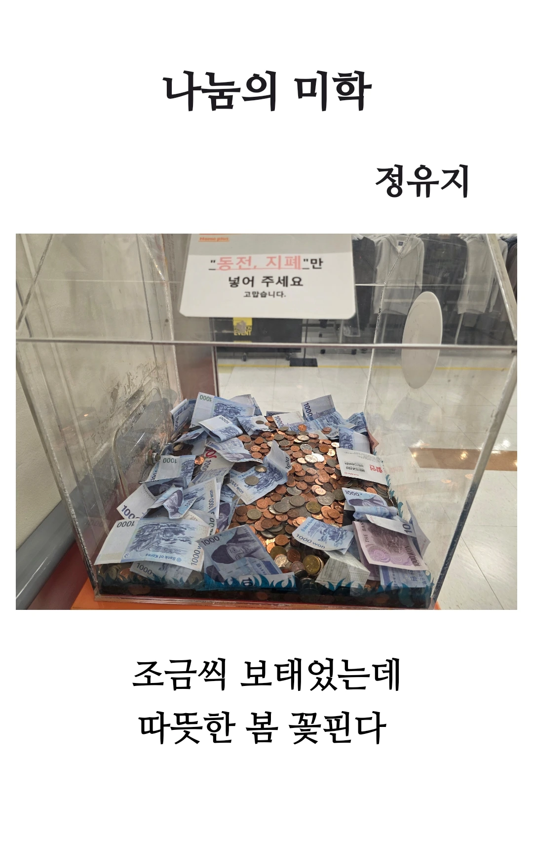 시적 문장을 통해 ‘나눔’을 거창하거나 거대한 희생이 아닌, “조금씩” 모여 커지는 작고 꾸준한 행위로 볼 수 있습니다. 시각적으로도 여러 종이돈과 동전이 한데 모인 모습은, 누군가에게는 미미한 기여일지라도 모두가 모이면 따뜻한 봄꽃처럼 활짝 피어난다는 희망을 보여줍니다. 이는 나눔이 주는 ‘연대감’과 ‘공동체성’의 힘을 은유합니다. 나눔 미학을 실천하는 경남정보대학교 디지털문예창작과의 액티브 시니어를 응원합니다.