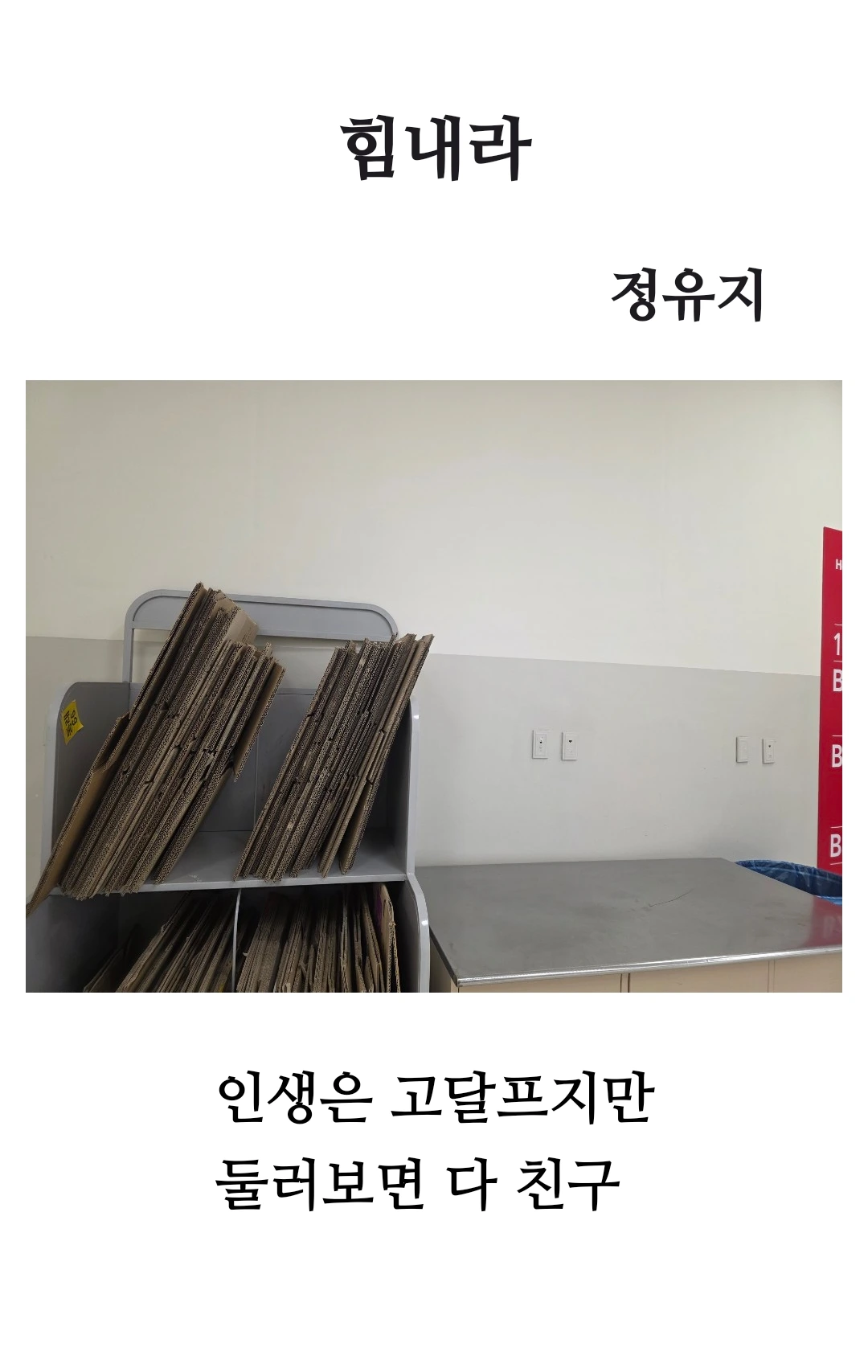 제목기호의 경우,‘힘내라’라는 제목 자체가 이 디카시의 핵심 메시지를 압축해 줍니다. 짧고 강렬한 이 말은 심리적·정서적 응원, 그리고 지속적인 인내를 촉구하는 격언처럼 읽힙니다. 택배상자와 연결되면서, 우리의 삶이 고단하지만 결국 각자 준비하고 지탱하며, 서로 연결되어 위로가 된다는 뜻을 품게 합니다.