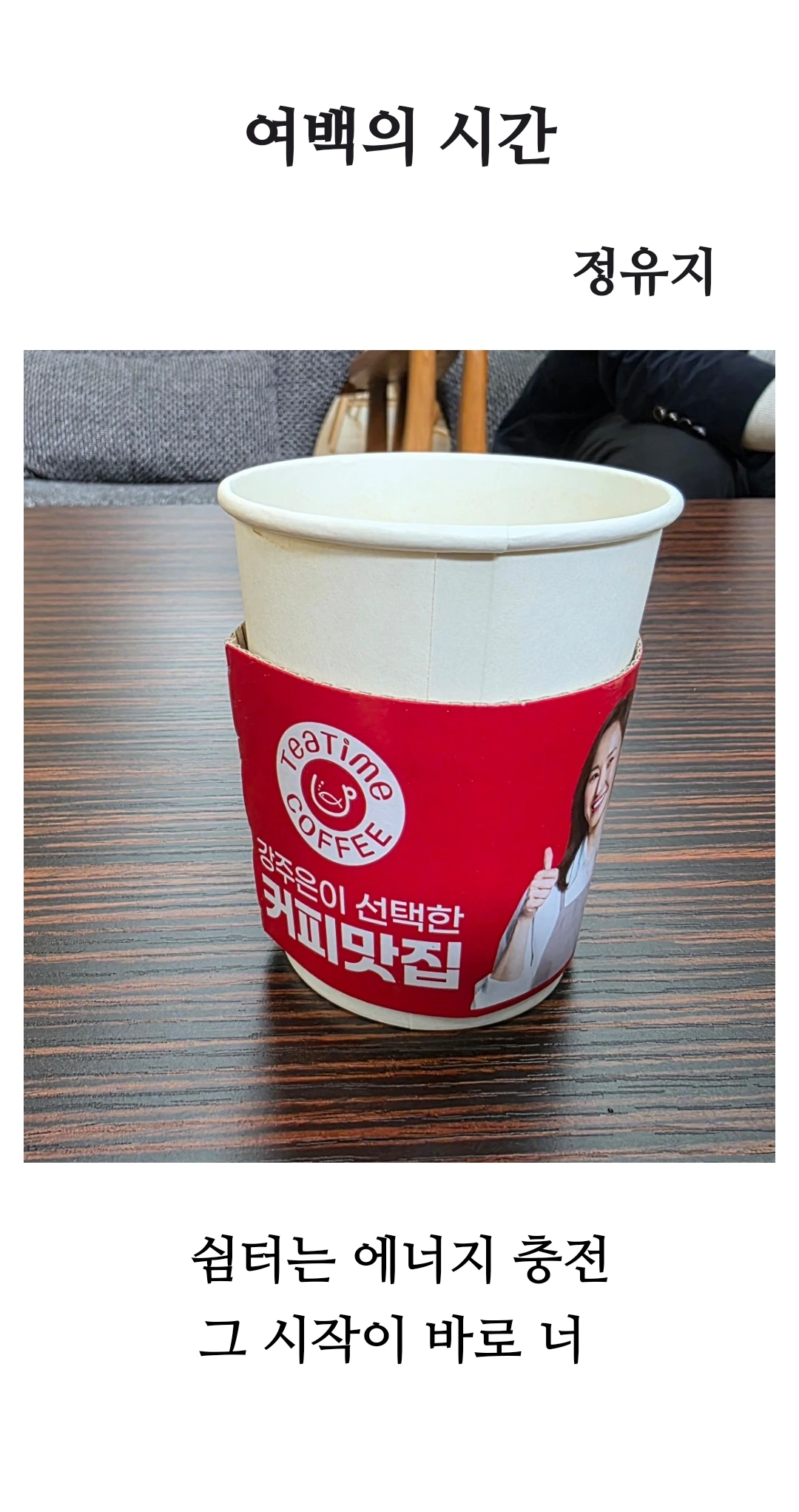 디카시 《여백의 시간》의 사진 속 빈 종이컵과 따뜻한 커피잔 홀더는 ‘비움’의 공간과 ‘쉼의 순간’을 상징합니다. 텅 빈 컵은 차오를 수 있는 공간, 즉 ‘여백’을 시각적으로 드러내어 감각적 휴식을 지닙니다. 커피잔의 붉은 손잡이 슬리브는 따뜻함과 활력을 주는 ‘에너지 충전’의 이미지를 담으며, 동시에 공간과 시간의 ‘여유’가 시작됨을 암시합니다. 빈 컵이 주는 시각적 여백과 대비되는 주변 배경의 무거운 질감은 현대인의 분주함을 상징하며, 그 사이 틈새로 자리한 ‘빈 공간’이 곧 고요한 쉼의 메시지를 전달합니다.