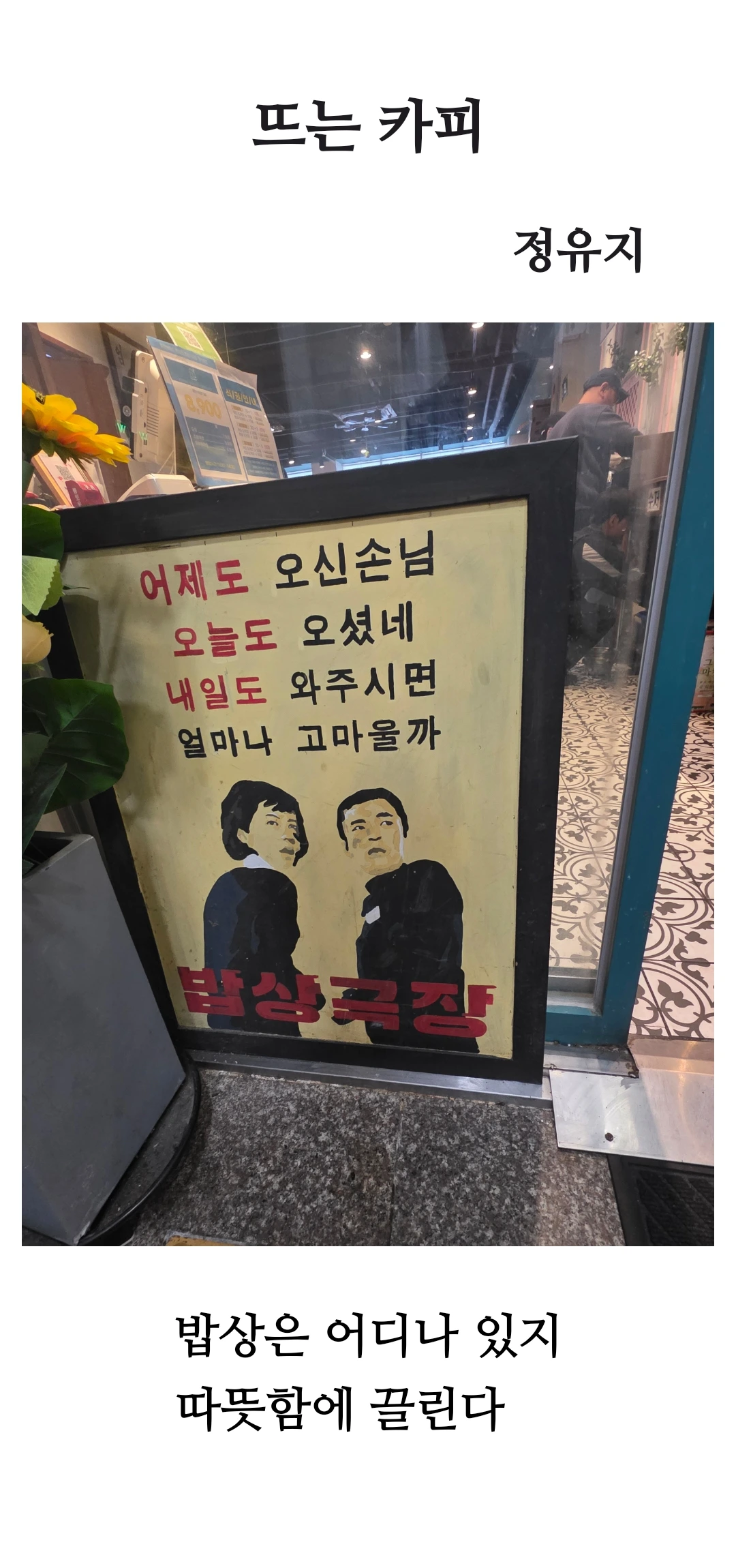 디카시 『뜨는 카피』의 영상기호(사진)는 한식 뷔페 입구 혹은 내부의 안내판을 담고 있습니다. 안내판에는 “어제도 오신 손님 오늘도 오셨네 내일도 와주시면 얼마나 고마울까”라는 글귀와 함께 두 사람의 실루엣 그림이 보입니다. 이 공간은 ‘밥상극장’이라고 명명되어 있어, 단순한 식사 공간을 넘어서 ‘공감과 소통의 장’, ‘따뜻한 만남의 무대’ 임을 시각적으로 암시합니다.