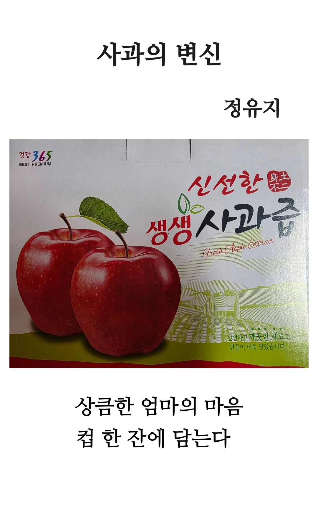 사과쥬스는 흔하지만 그 속에 담긴 정성과 마음이 얼마나 깊고 풍성한지 보여줍니다. 단순히 건강식품을 넘어 ‘엄마의 상큼한 마음’을 담는 매개체가 된 변신은, 일상을 특별하게 만드는 ‘작은 기적’입니다.
