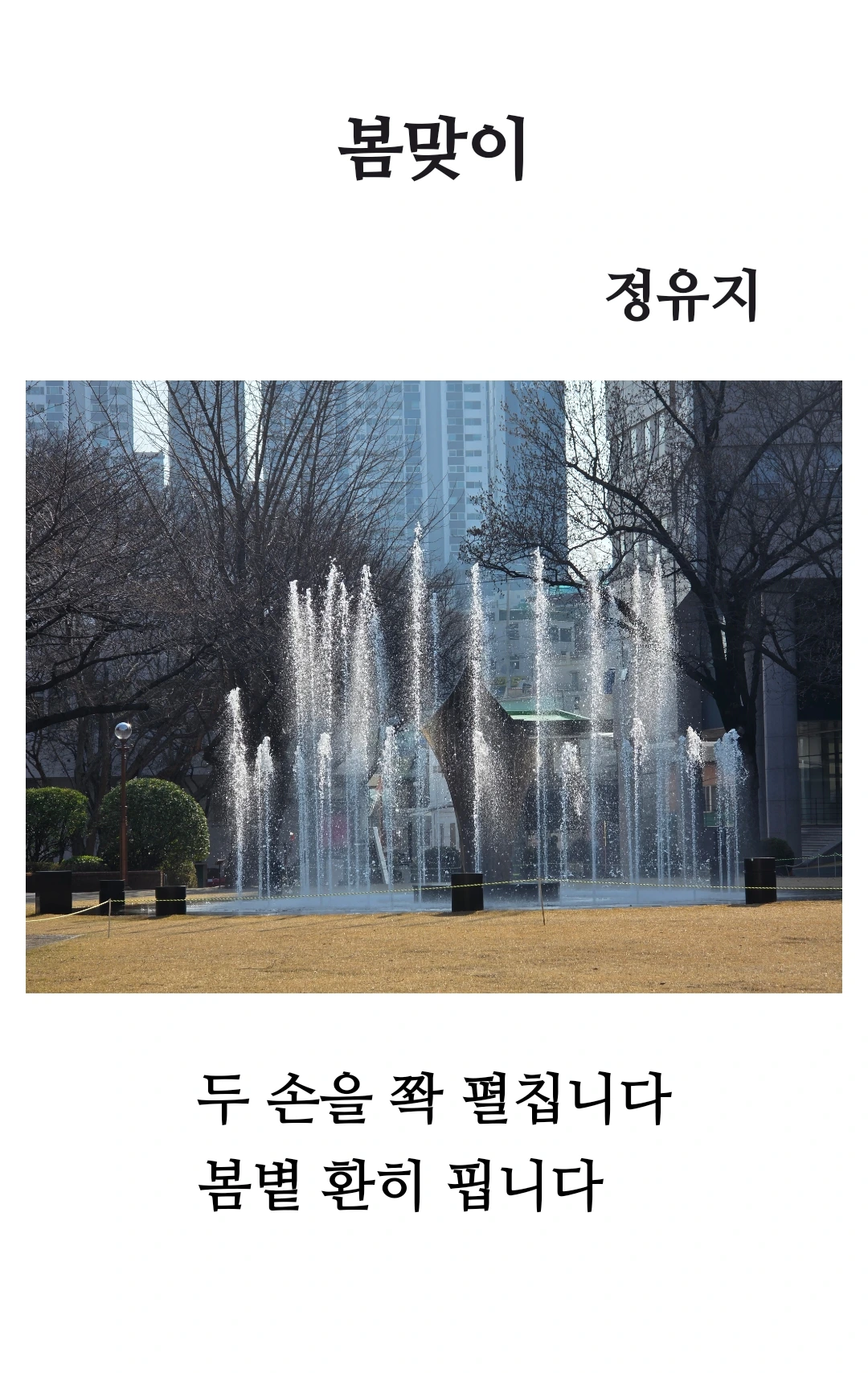 디카시 <봄맞이>의 영상기호는 분수대 이미지를 재생시키고 있습니다. 공원 속 분수대에서 뿜어져 오르는 물줄기는 역동성, 생명력, 새로운 시작을 상징합니다. 겨울의 잔재처럼 보이는 앙상한 나무들 사이에서 솟아오르는 분수의 물은 반복되는 생명의 순환과 계절의 변화, 즉 ‘봄맞이’의 핵심적인 시각적 상징으로 작용합니다.