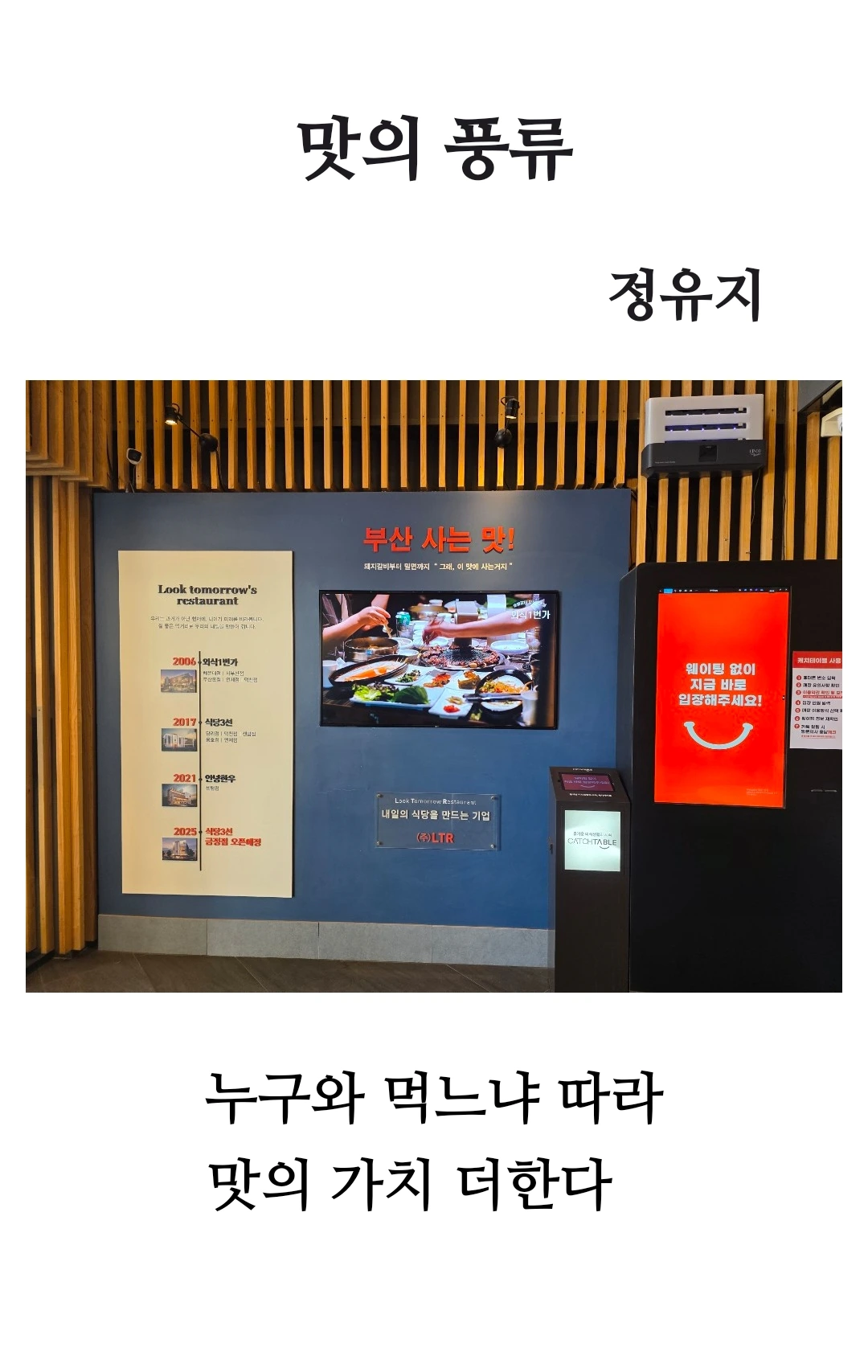 디카시 <맛의 풍류>의 영상기호(사진) 속 공간은 부산의 맛과 식문화를 상징적으로 보여 줍니다. 벽면에 걸린 화면은 생생한 식사 현장을, 화려한 음식과 사람들의 손놀림은 ‘함께 나누는 맛’의 순간을 포착하고 있습니다. 이 영상기호는 ‘맛’ 자체보다는 ‘누구와, 어떻게, 어디서 먹느냐’에 따라 맛의 가치와 경험이 다름을 어필하고 있습니다.