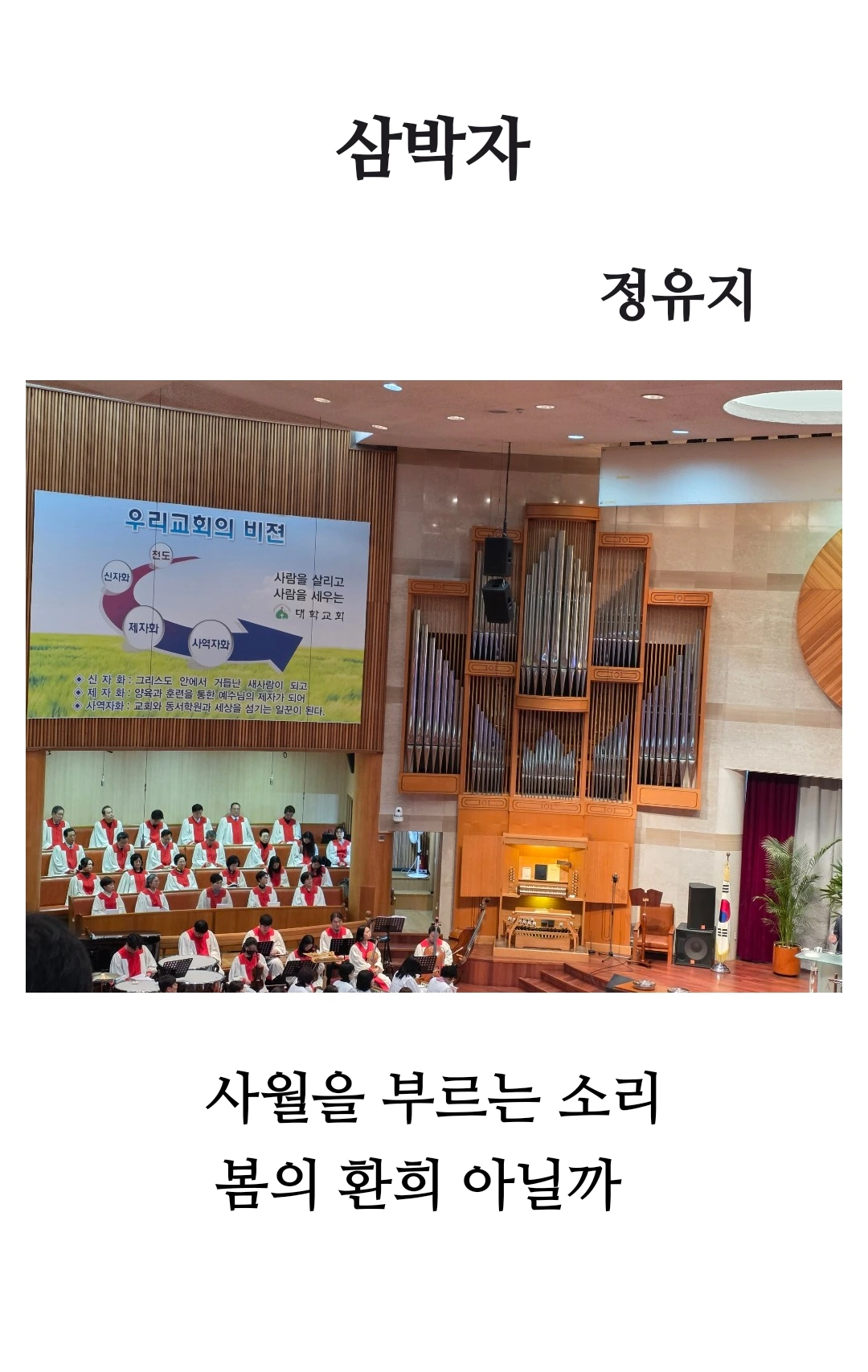 디카시 <삼박자>의 영상기호(사진) 속 공간은 대학교회 예배당이며, 오르간과 성가대가 한데 어우러진 모습을 순간 포착했습니다. 이 영상은 ‘삼박자’라는 음악적 시간 단위를 공간과 인물, 악기 배치를 통해 미적 효과를 자아냅니다.