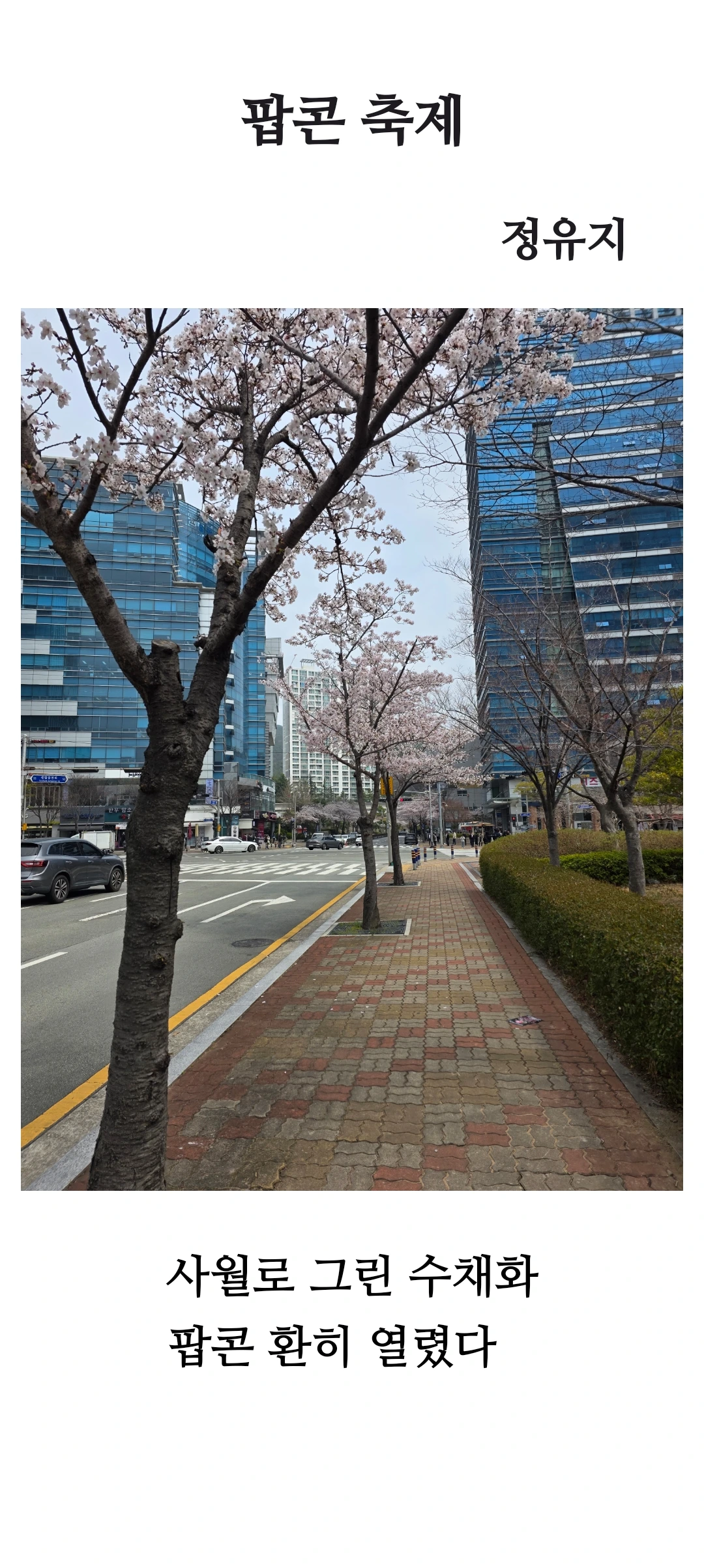 ‘사월로 그린 수채화 / 팝콘 환히 열렸다’라는 시적 문장은 사월이라는 시간적 배경 안에서 벚꽃이 마치 수채화 물감처럼 번지며 피어난다는 서정적 이미지를 담고 있습니다.