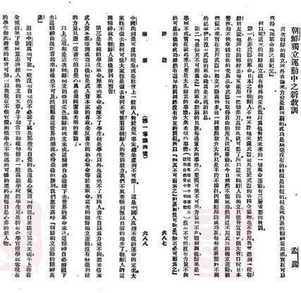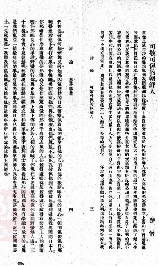 조선 민족 독립활동의 빛이 있으니 우리 중국 민족의 시들고 쓰러진 치욕이 더욱 잘 보인다. 공화 체제가 벌써 8년이 되었지만 일반 국민은 어느 하루라도 분명하고 정확한 의식의 활동이 없었다-신해혁명, 대부분이 강도이고 망나니들로서 광복의 이름을 빌어 강탈만 일삼았다. 국민과 정치는 서로 천백만 길이나 멀리 떨어졌다. 본국과 외국의 군벌들이 연합하여 핍박하여도 어디 감히 조그마한 반항조차 엄두를 내지 못하고 있다. 서남호법군(西南護法軍)은 결국 국민을 두 동강으로 나누어버렸다. 농촌의 농민 백성들이 감히 소리를 내지 못할 뿐만 아니라 주절주절 시끄럽다는 유명인들, 신사들, 정치인들, 상인들, 교육계마저도 공공연하게 자신의 주인 된 국민의 자격을 저버리고 제3자의 입장에서 정국을 논하고 있다. 이번 조선인들의 독립활동을 보라. 무기가 없다고 반항하지 못하고 주인 된 자격을 포기하고 제3자가 되는 것인가? 우리는 조선인들과 비교해 보면, 참으로 하늘과 땅 앞에 부끄럽기 짝이 없다.
