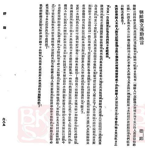 민족자결의 외침이 우리 아시아에까지 전해져 온 이후, 저 2,000만의 자유를 모조리 빼앗기고 고통 속에서 죽기를 기다리던 조선인들은 하늘과 땅에 넘치는 기쁨으로 독립운동을 하였다. 파리평화회의에 편지를 보내고 각 나라에 전보를 보내어 자신들이 일본에 탄병(呑倂·남의 재물이나 영토를 자기 것으로 만듦)된 이후 참으로 이 천하에 있을 수 없는 각종 가혹한 학대와 잔혹한 대우를 받았다고 탄원하였다. 지난 십여 년 동안 조선인들은 죽음으로 서로 흩어졌고 인생의 즐거움이 전혀 없었다. 현재 그들은 깃발을 세워들고 자신의 일들을 강행해야 하지만 그 강도 우두머리와 같은 자들이 말하는 공리와 정의는 전부 코 막고 입 비뚤어진 말로, 그 누구에게도 공평한 판단을 주지 않을 것이다.