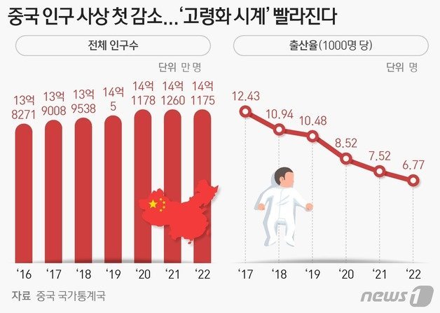 2011년 중국의 15~64세 노동연령인구의 총인구 중 점유 비중이 74.4%로, 전년 대비 0.1% 감소했다. 이는 중국의 노동연령인구 비중이 2002년 이후 처음으로 감소한 것인데, 2012년에도 다시 0.3% 감소했다. 이는 세계 최다 인구 국가인 중국의 인구 연령 구조가 성년형에서 노령화 단계에 진입하고 있음을 의미한다.