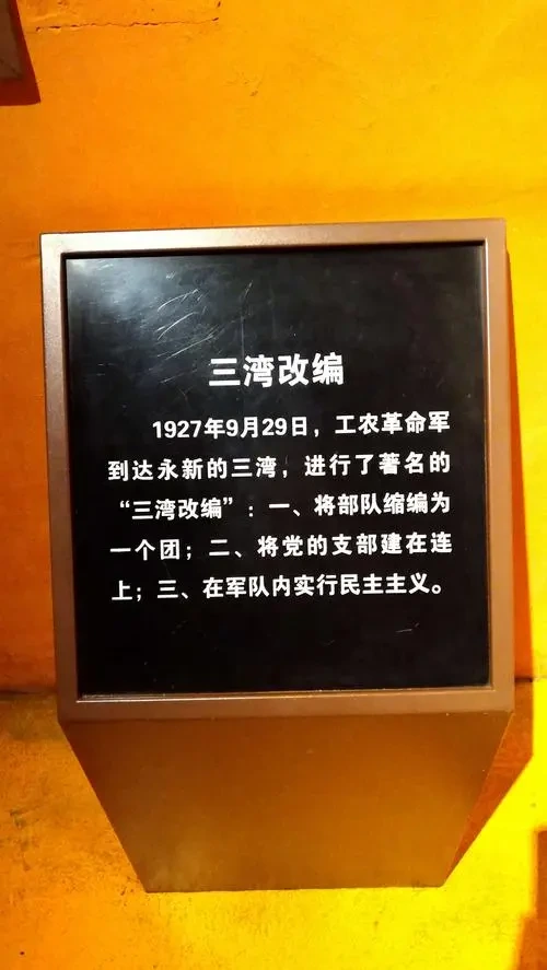 1927년 9월 29일에는, 장시성 용신(永新)현 산완촌(三灣村)에 도착 후 부대를 개편했다. 주요 개편 내용은, 원래의 1개 사(師)를 1개 단으로 축소 개편하고 연대에 당 지부(黨支部)를 건립했다. 또한 각급 사병(士兵)위원회를 건립하고 민주적 관리 제도를 실행하여 정치적으로 장교와 사병의 평등을 실현하고자 했다. 중공 당사(黨史)에서는 이를 ‘산완개편(三灣改编)’이라 부르고 있다.