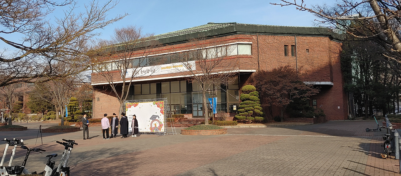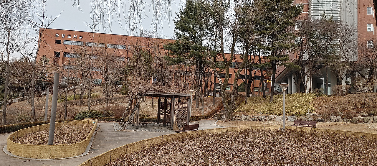 회기역에 내려서 후문까지 걸어 가는 과정도 좋다. 골목길의 카페, 치킨집, 복사제본집, 문방구, 편의점, 부동산중개사무소 등을 둘러보면서 걸어가고 후문 가까워 지면서 경사로를 올라가는 과정 모두가 몸과 마음의 온전한 힐링 과정으로 느껴진다. 제법 경사진 비탈길 골목길을 걸어 올라서 후문에 들어선 후에는 테니스장 옆길로 중앙도서관 좌측면을 지나면 도서관 정면 입구다.