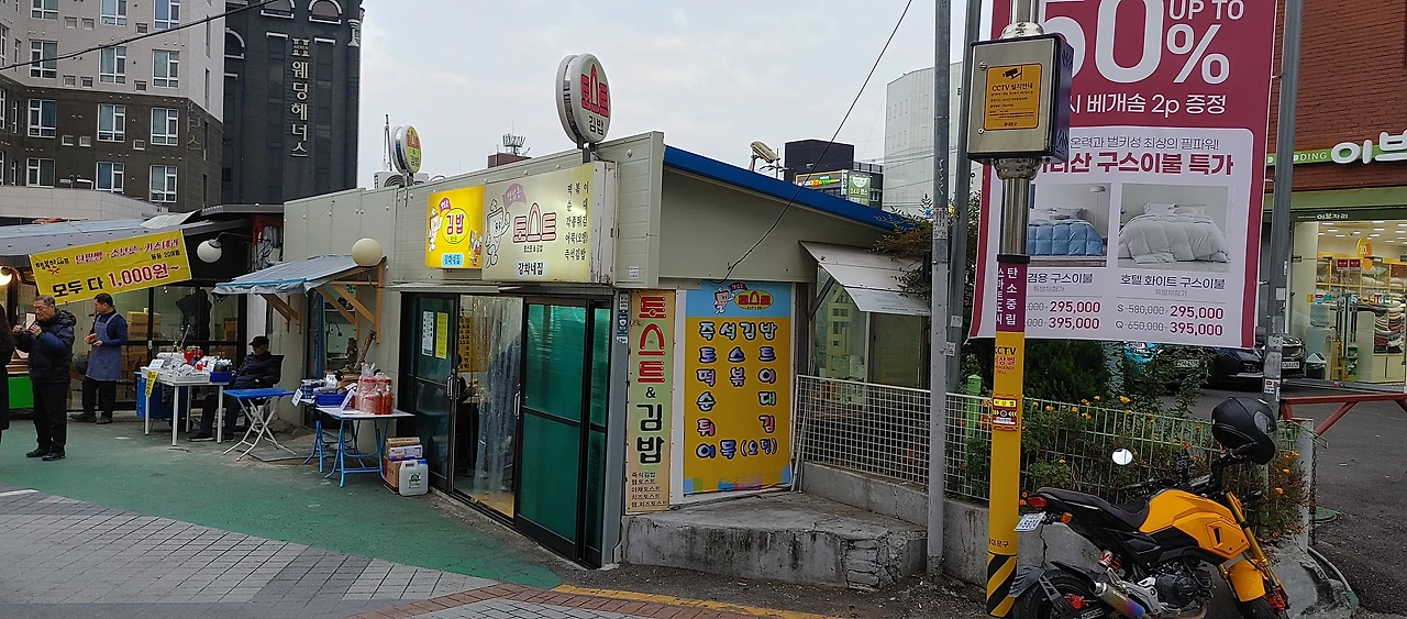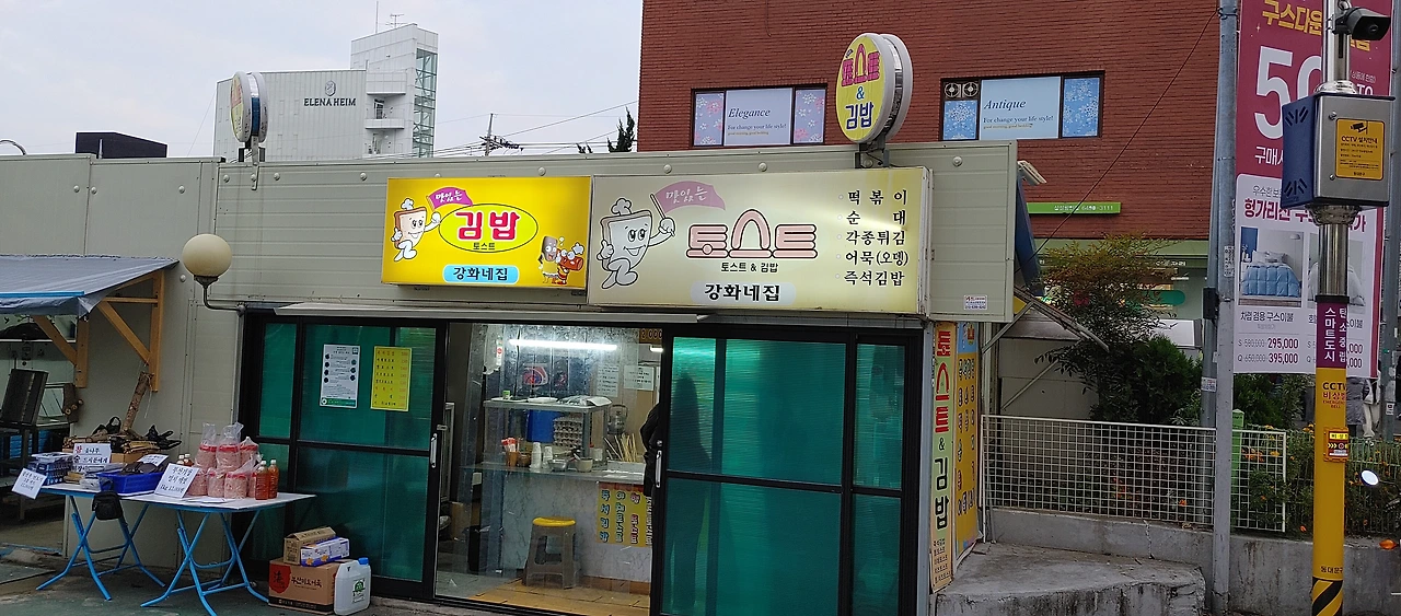 깜빡잠을 자서 그런 지 회기역 밖으로 나오니 정신도 맑고 몸에 생기가 돌면서 출출하다. 이 때쯤에 시립대 방향 출구 계단으로 내려가 버스 정류장 앞에 있는 토스트, 김밥, 어묵오뎅, 순대, 튀김 등 간판을 단 집이 보인다. 간판 밑에 조그맣게 "강화네 집"이라 씌어 있는 것으로 봐서 주인 아주매 할머니의 고향이 강화도일 거라 짐작한다.
