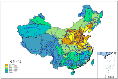 중국의 수자원 분포는 남쪽은 풍부하고 북쪽은 부족하다.