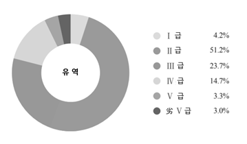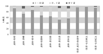 7대 하천 수계별 수질조사에서는 1~3등급 4~5등급, 5등급 이하 수질 면적의 점유율이 각각 70.0%, 25.5%, 4.5%로 나타났다.