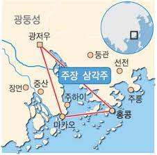 수로망이 밀집해 있는 주강 하류 주강삼각주 평원은 농업 생산과 수운을 기초로 일찍이 중국 내의 경제가 발달한 도시 밀집지구가 형성·발전해 ‘남방의 금삼각(南方金三角)’이라 불린다.
