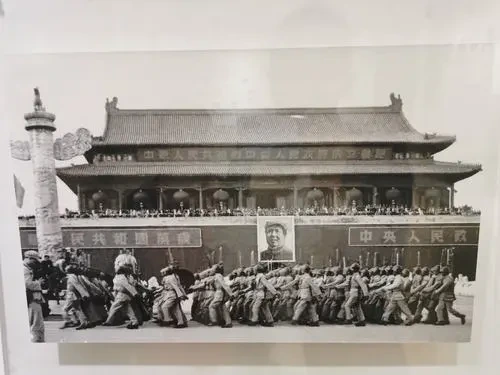 중화인민공화국 건국 기념식은 1949년 10월 1일 오후 3시 베이징 톈안문 성루(城樓)에서 광장에 모인 약 30만 명의 군중과 함께 거행되었다. 바로 1시간 전인 오후 2시에 중난하이 근정전(勤政殿)에서 개최된 중화인민공화국 중앙인민정부위원회 제1차 회의에서 중앙인민정부 비서장으로 선출된 린보취(林伯渠, 1886~1960년)가 개회를 선포한 후 (인민혁명군사위원회 주석) 마오쩌동이 “중화인민공화국 중앙인민정부가 오늘 성립되었다. 중국 인민이 일어섰다”라고 선포했고, “인민공화국 만세”와 “마오 주석 만세” 등의 환호 소리 속에 혁명을 상징하는 붉은 바탕에 공산당을 상징하는 큰 별과 그 별을 둘러싼 노동자(工), 농민(農), 지식인(士), 민족 자산계급(商)을 의미하는 네 개의 작은 별이 노란색으로 그려진 오성홍기(五星紅旗)가 게양되고 국가로 지정된 「의용행진곡」이 연주되고 28발의 예포가 터졌다.